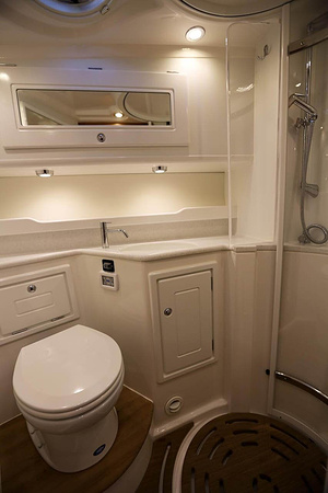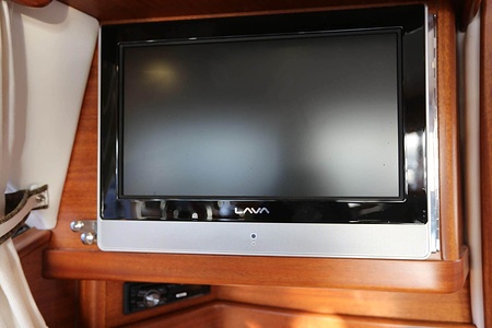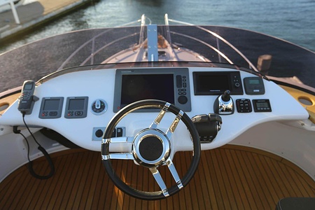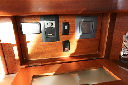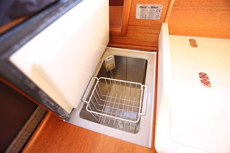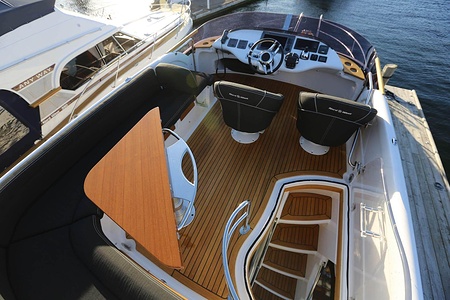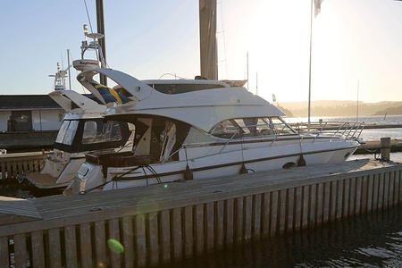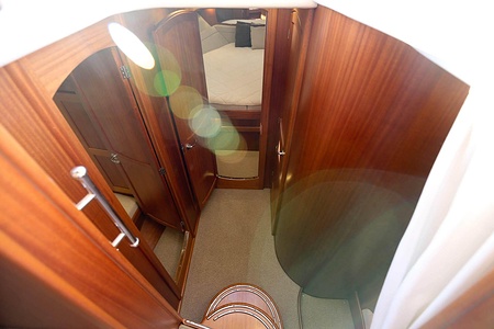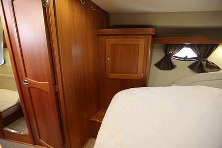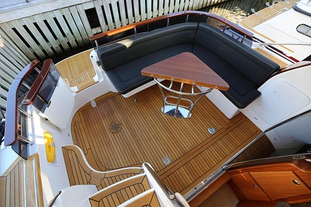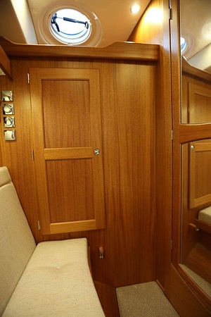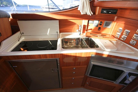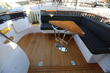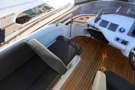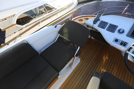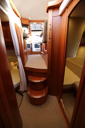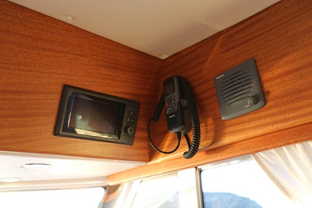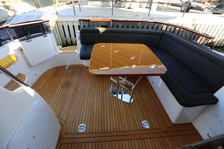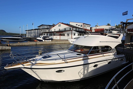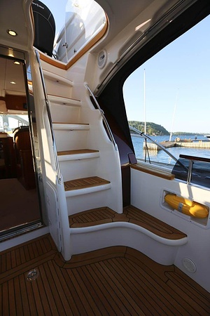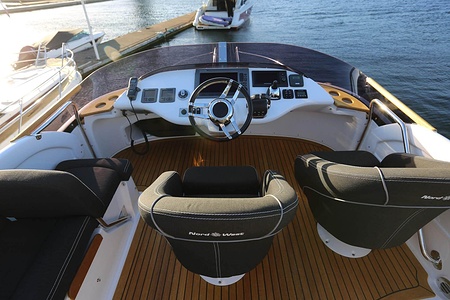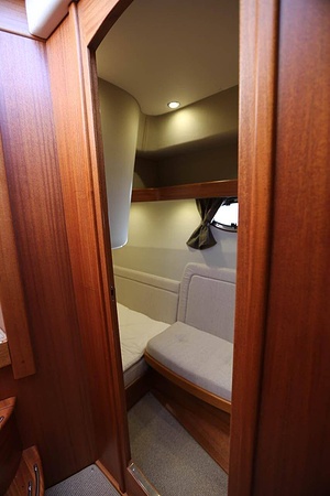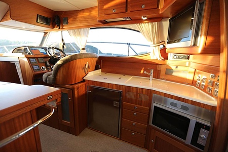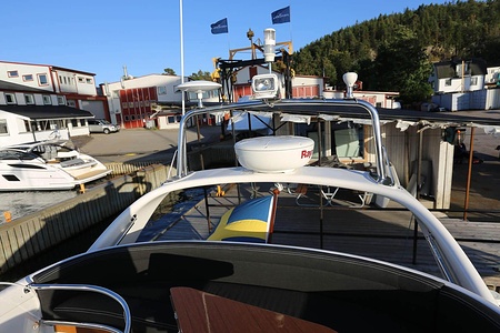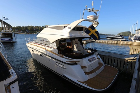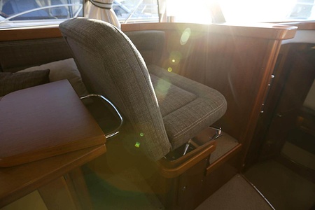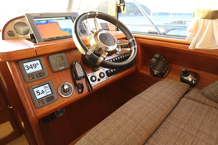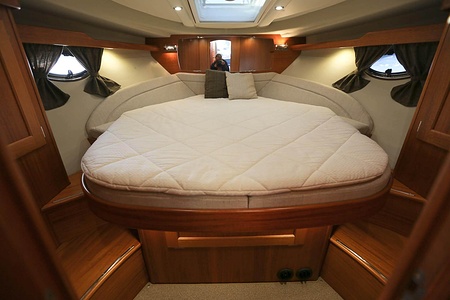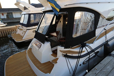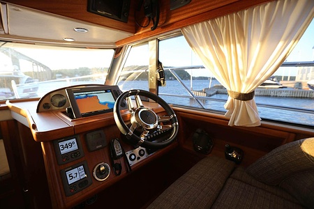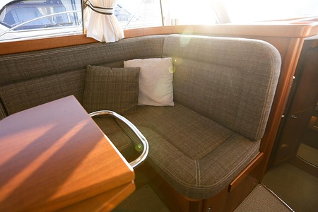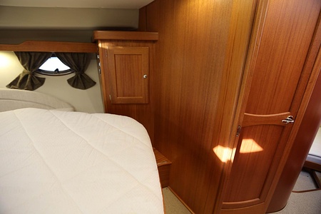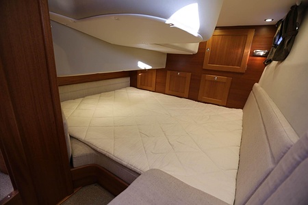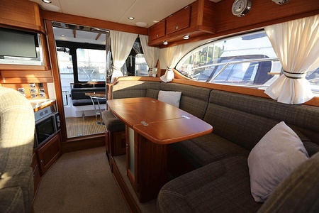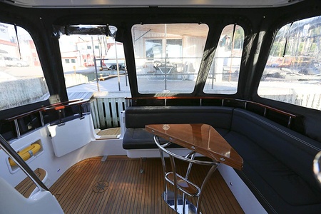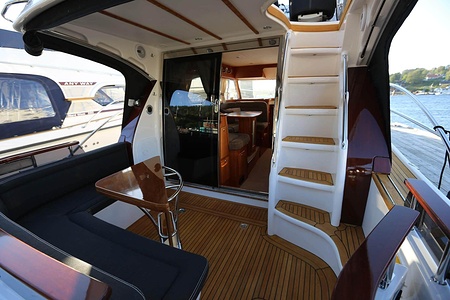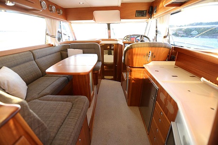 NordWest 370 Flybridge är en välbyggd båt med fem bäddar i tre kabiner och WC med duschkabin. På babord sida, mittemot förarplatsen kan man vända salongssoffan i framkant och få en passagerarsofa vänd i färdriktningen. Pentry på styrbord sida i salongen.