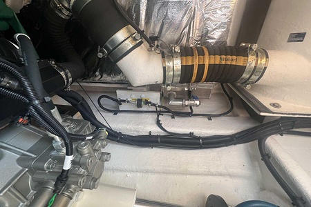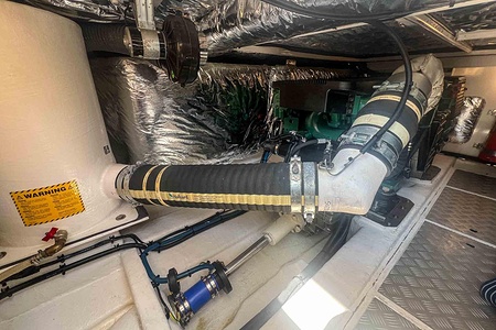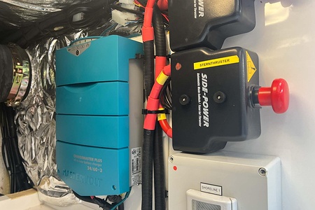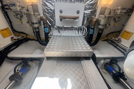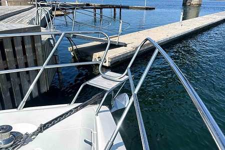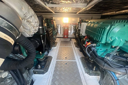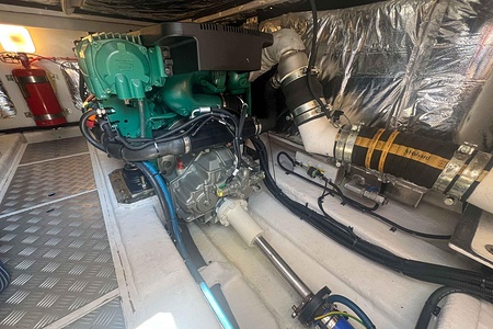 The boat is very well equipped and powered by twin Volvo Penta D6-435 engines with low hours, providing a safe, economical, and powerful ride. The equipment level is high and includes, among other things, full teak decking, anchor winches both at the bow and stern, bow and stern thrusters, as well as a practical lift/cradle for a RIB or jet ski.
