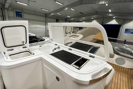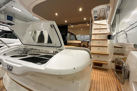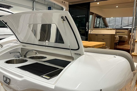 Optional flybridge wetbar incorporating sink, electric griddle/BBQ, waste bin and top loading coolbox
