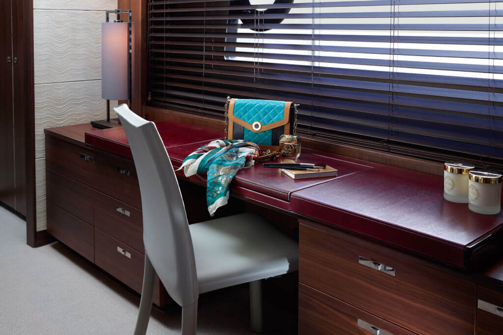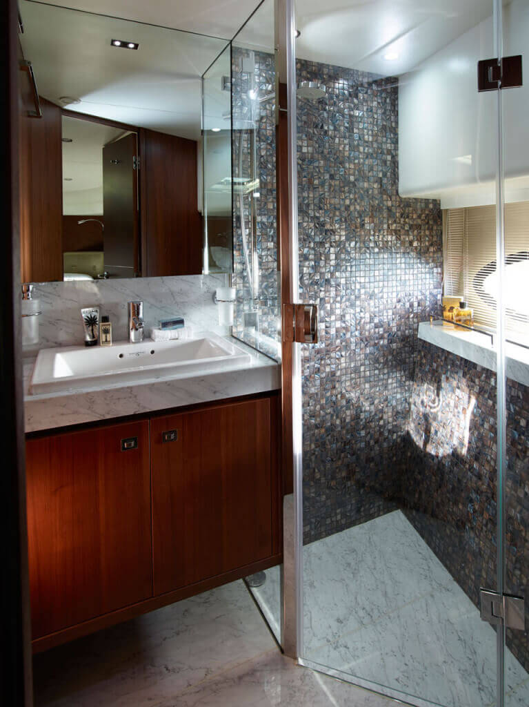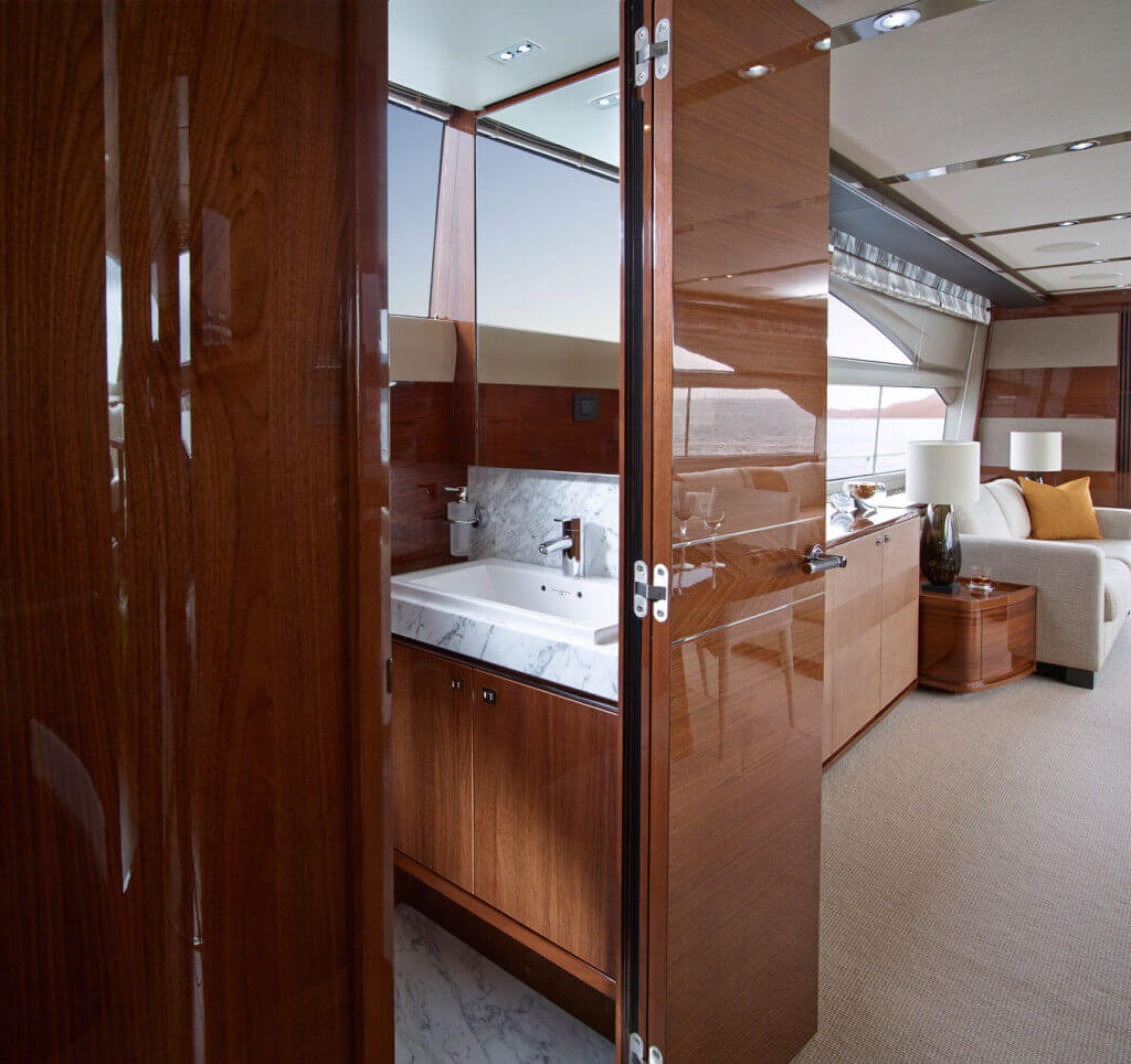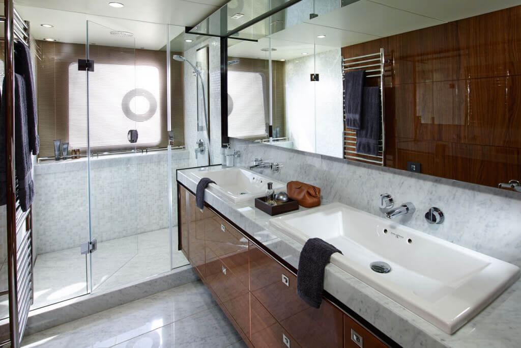 There is a full-beam master cabin reminiscent of a luxury hotel suite, which has a large ensuite and a walk-in wardrobe. The hull window starboard enables the owner to relax with the sea at eye level. A VIP in the bow and twin and double guest cabins, which are all ensuite, make up the rest of the guest accommodation. By walking around the guest accommodation, one cannot fail to be impressed by the attention to detail and finish throughout.