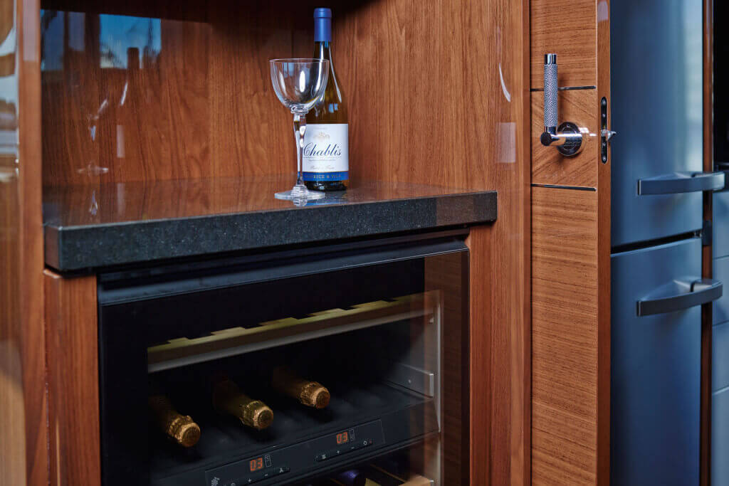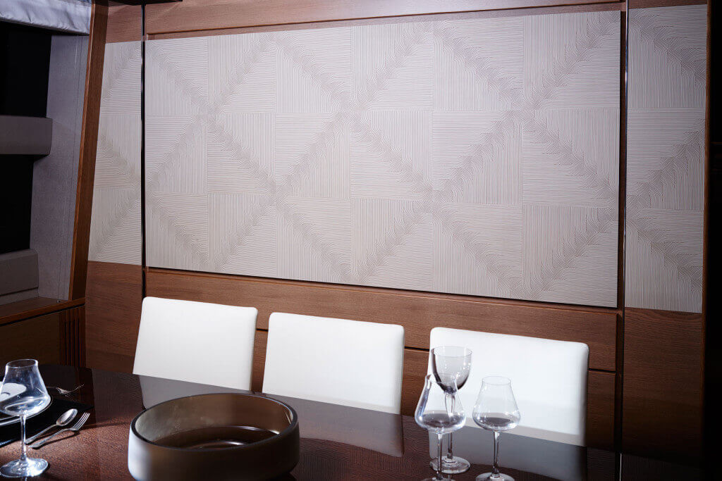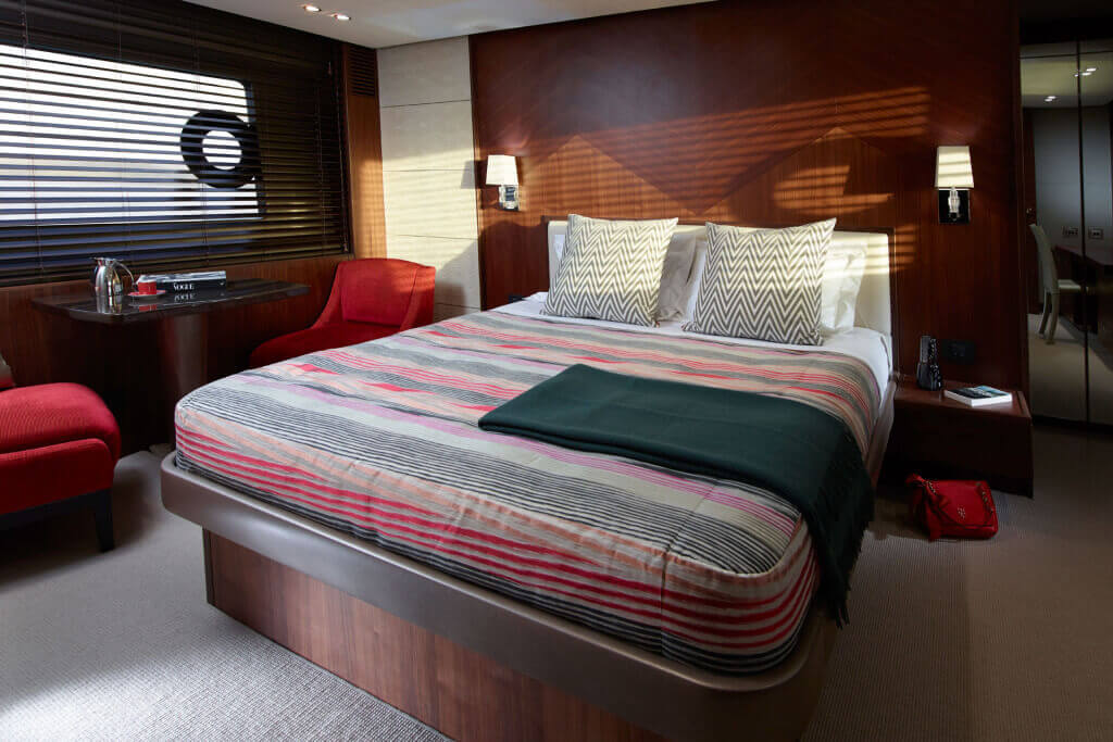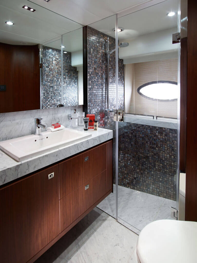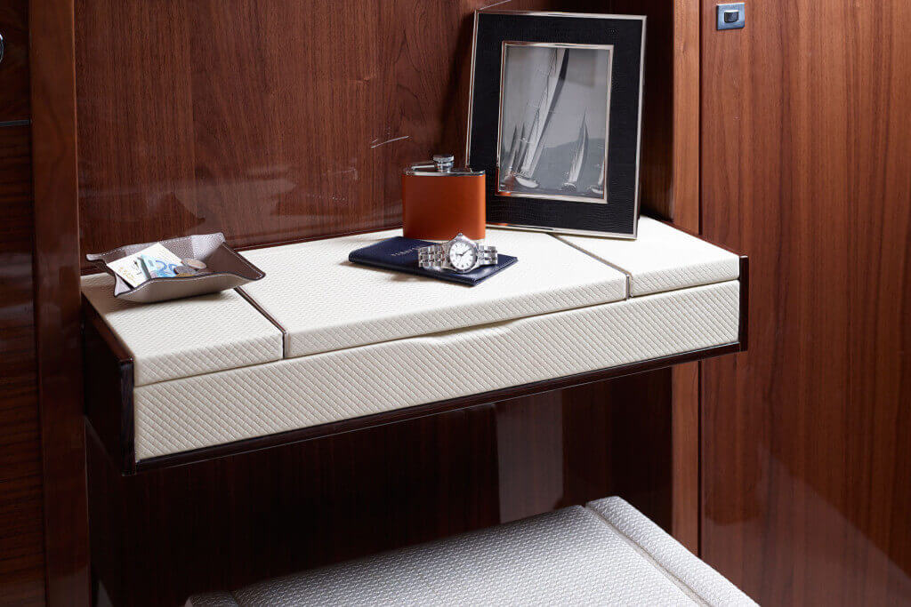 There is a full-beam master cabin reminiscent of a luxury hotel suite, which has a large ensuite and a walk-in wardrobe. The hull window starboard enables the owner to relax with the sea at eye level. A VIP in the bow and twin and double guest cabins, which are all ensuite, make up the rest of the guest accommodation. By walking around the guest accommodation, one cannot fail to be impressed by the attention to detail and finish throughout.