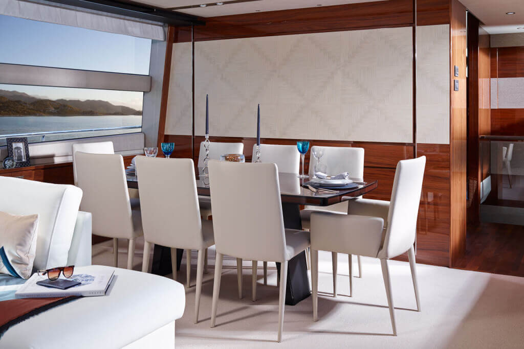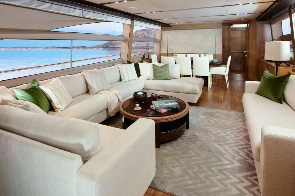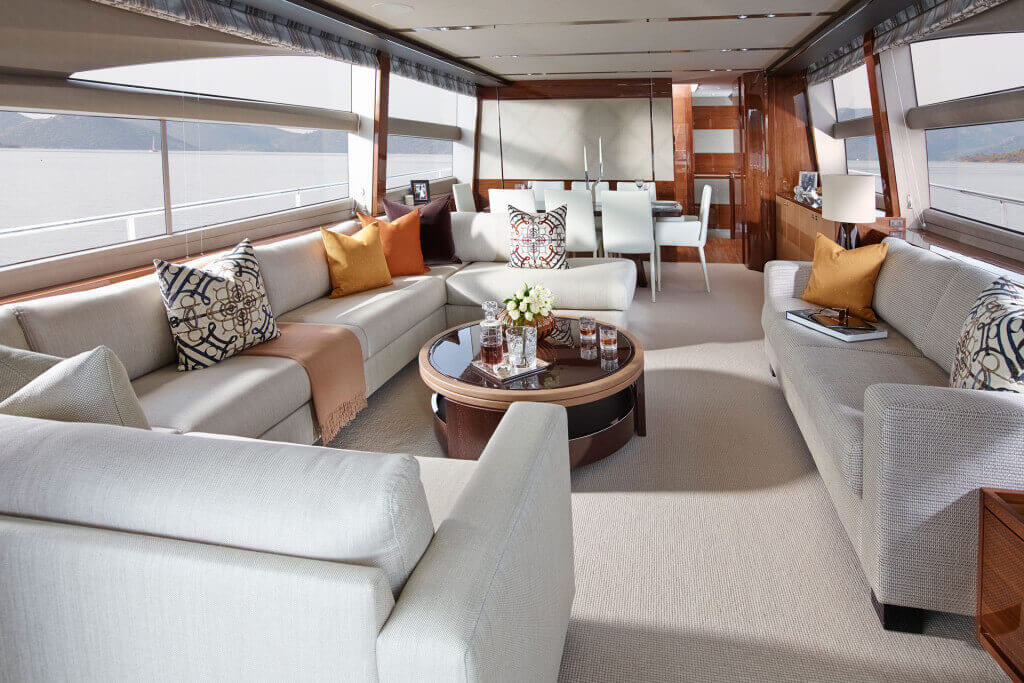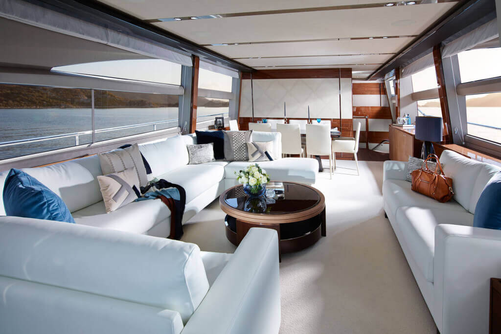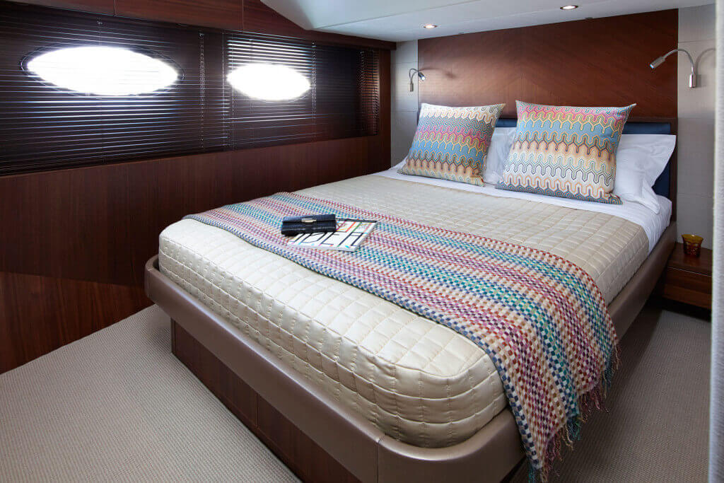 Plenty of space throughout the deck affords the guests an opportunity both to socialise and also to do their own thing. The flybridge is enormous and offers a mix of sunpads, seating and a wet-bar ensuring that this is a great place for a party and a real pleasure to spend time on. The saloon not only provides a comfortable space to relax but also a more formal dining area which can seat up to 8 guests comfortably and the windows that run along each side provide great visibility.