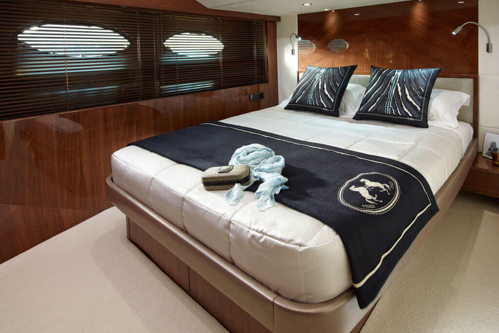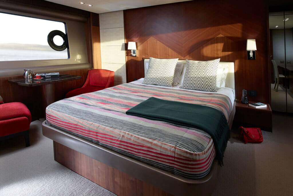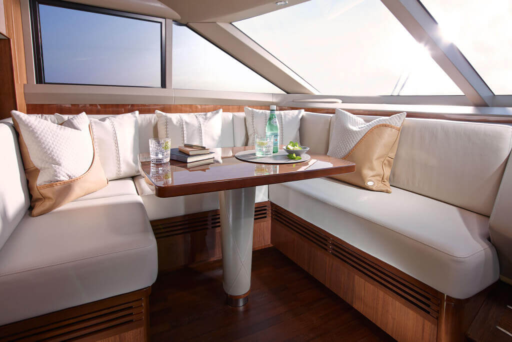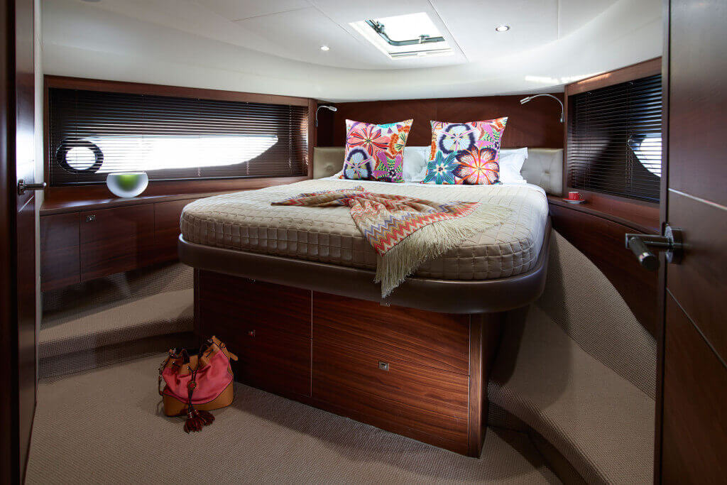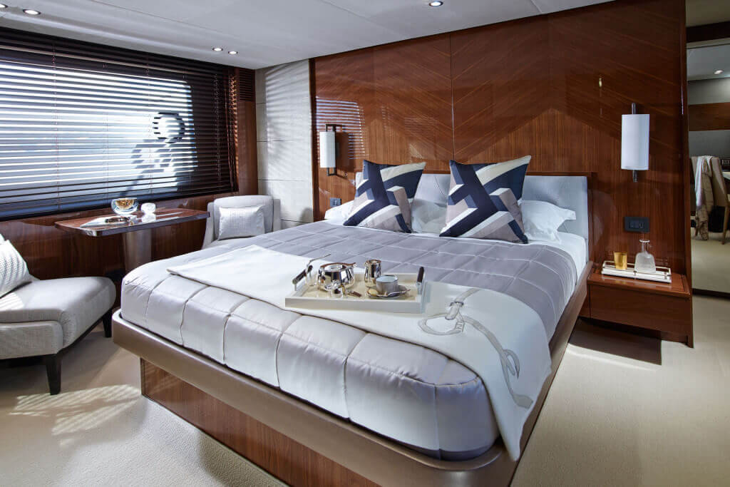 Plenty of space throughout the deck affords the guests an opportunity both to socialise and also to do their own thing. The flybridge is enormous and offers a mix of sunpads, seating and a wet-bar ensuring that this is a great place for a party and a real pleasure to spend time on. The saloon not only provides a comfortable space to relax but also a more formal dining area which can seat up to 8 guests comfortably and the windows that run along each side provide great visibility.