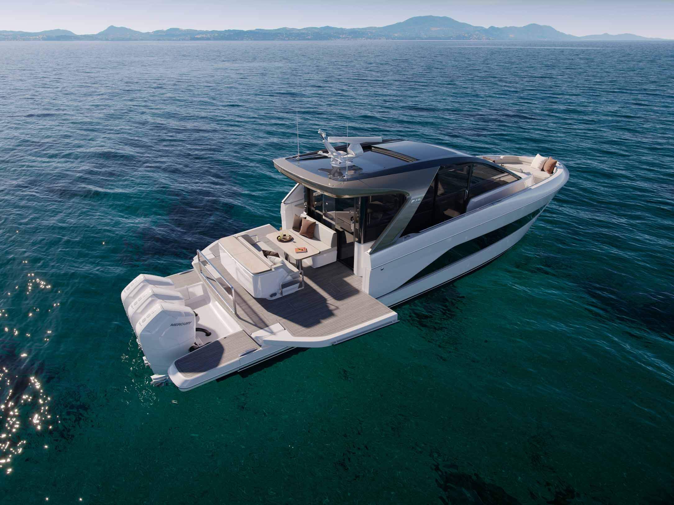 Her enclosed saloon brings together lounge and galley areas with panoramic windows and an optional sliding roof, allowing owners to enjoy an open-air feeling or complete shelter at the touch of a button. Triple sliding patio doors connect the saloon seamlessly to the cockpit, where a spacious dining area and wetbar encourage social gatherings. Twin side doors at the helm provide direct deck access, enhancing practicality on board. For inboard engine variants, an optional up/down hydraulic bathing platform makes water access effortless.