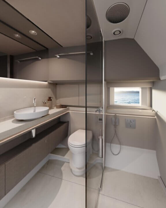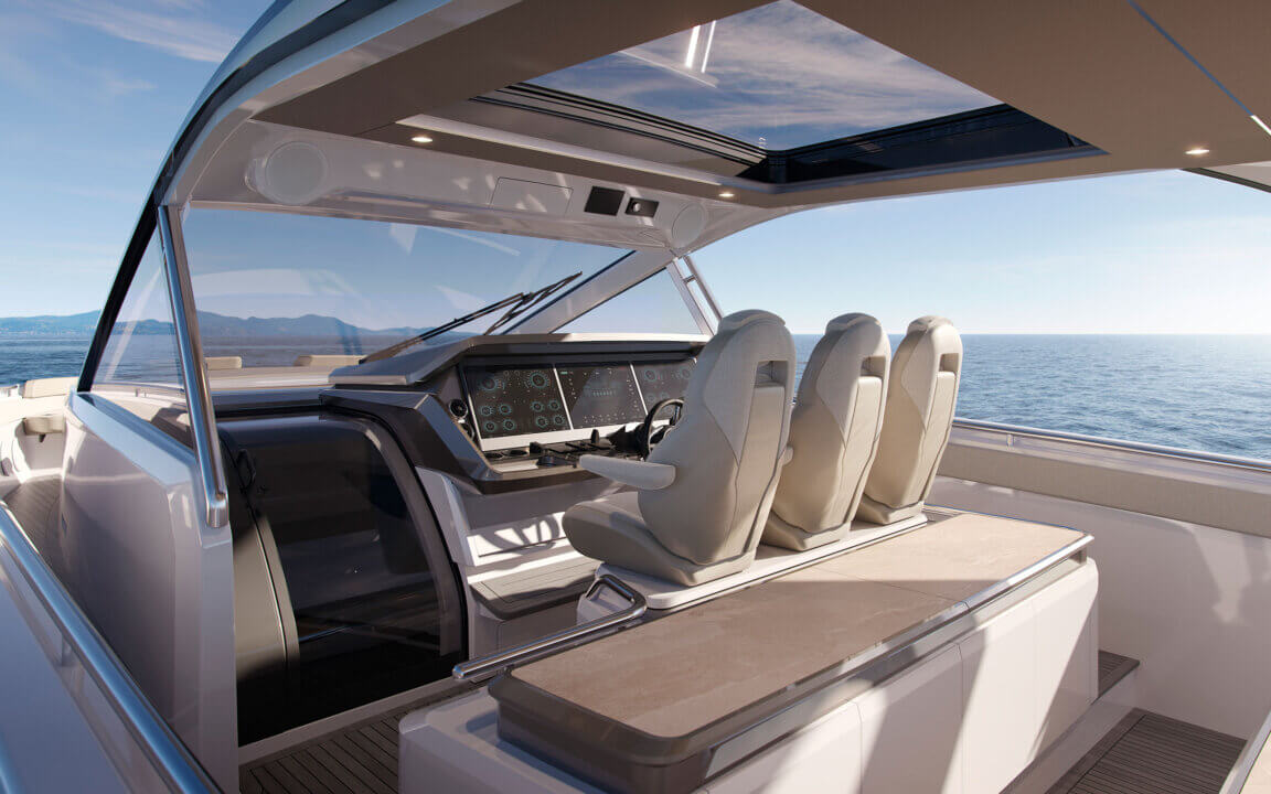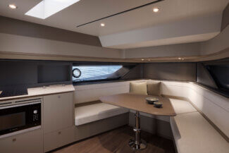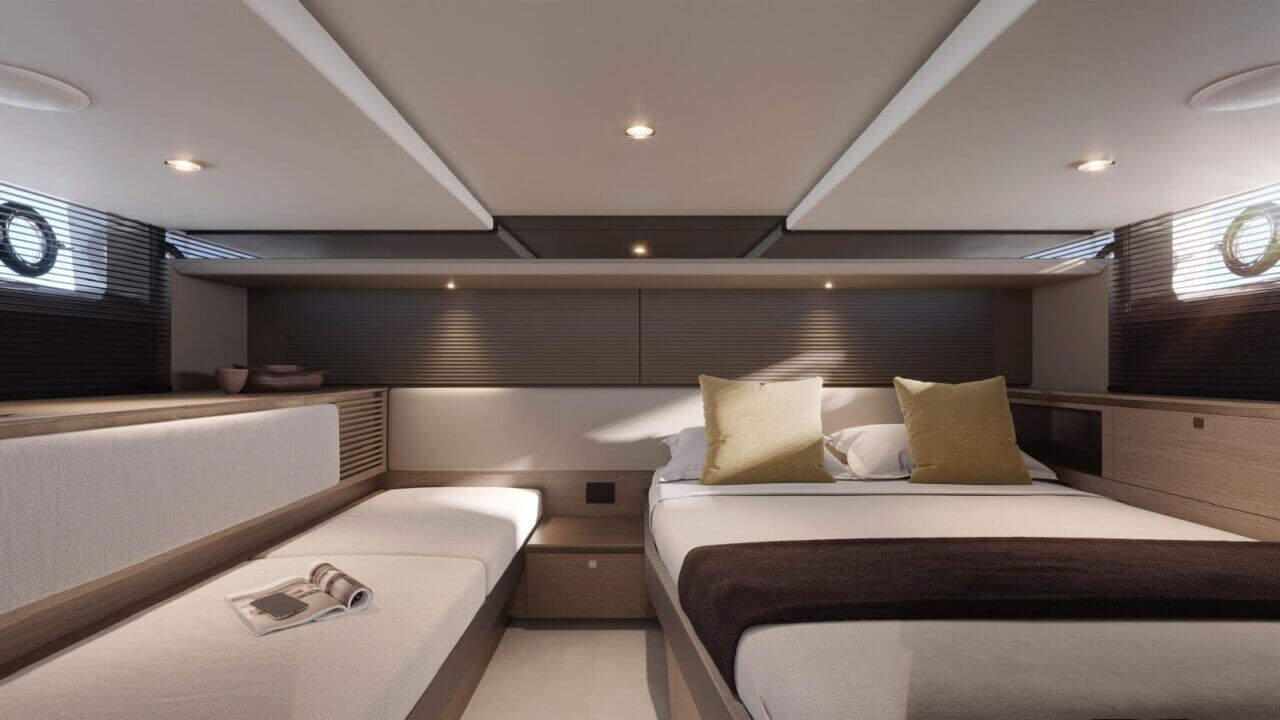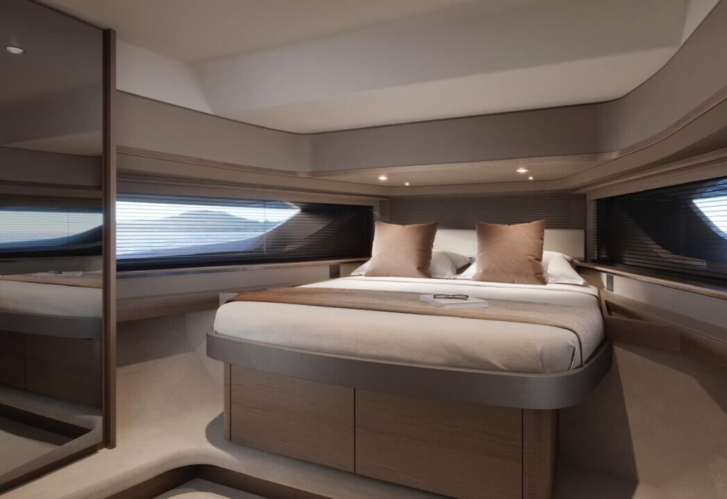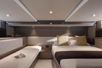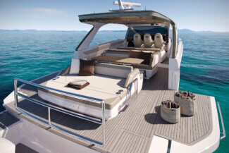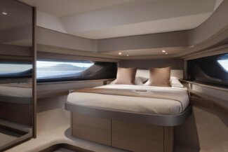 Her open main deck celebrates outdoor living, featuring a spacious cockpit with sunpad, seating, dining area and dual wetbars, while triple helm seats create a distinctly sporting character. Below deck, the flexible arrangement offers a saloon and aft cabin as standard, with the option to specify a forward cabin or lower deck galley to suit every lifestyle.