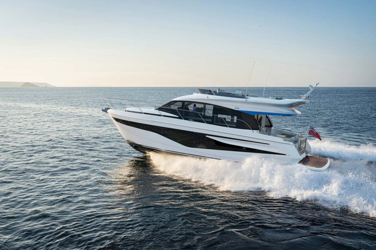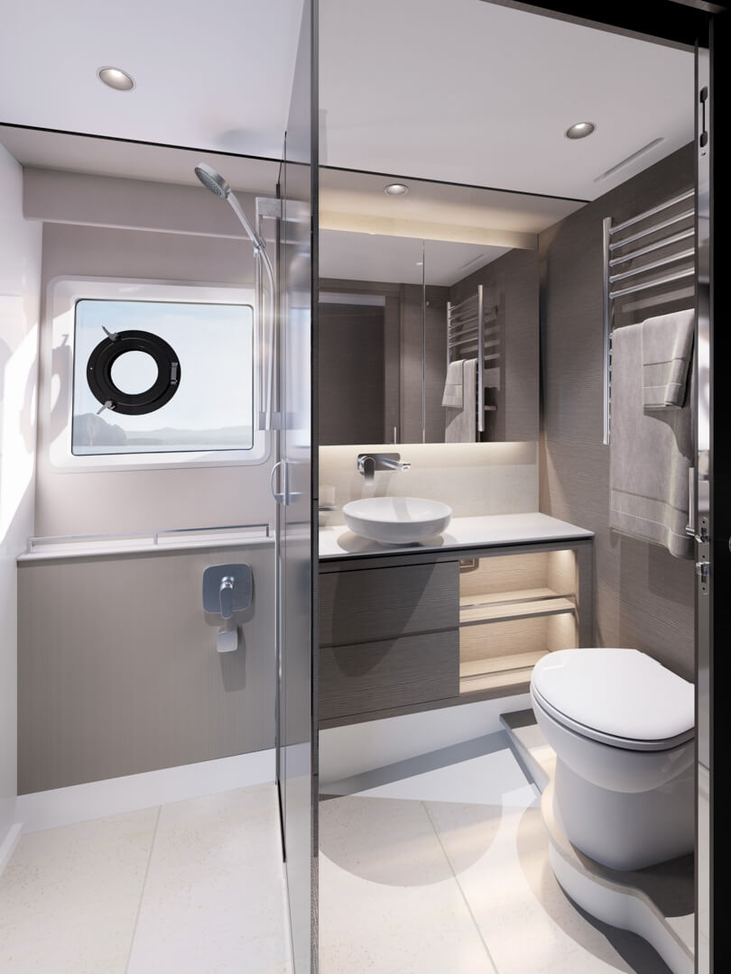 Below deck, the F54 accommodates six guests across three cabins, including a full-beam owner’s stateroom with ensuite, a forward double, and a convertible twin. An optional crew cabin, extended fuel tanks, and a washer/dryer installation further enhance her practicality for longer stays at sea.