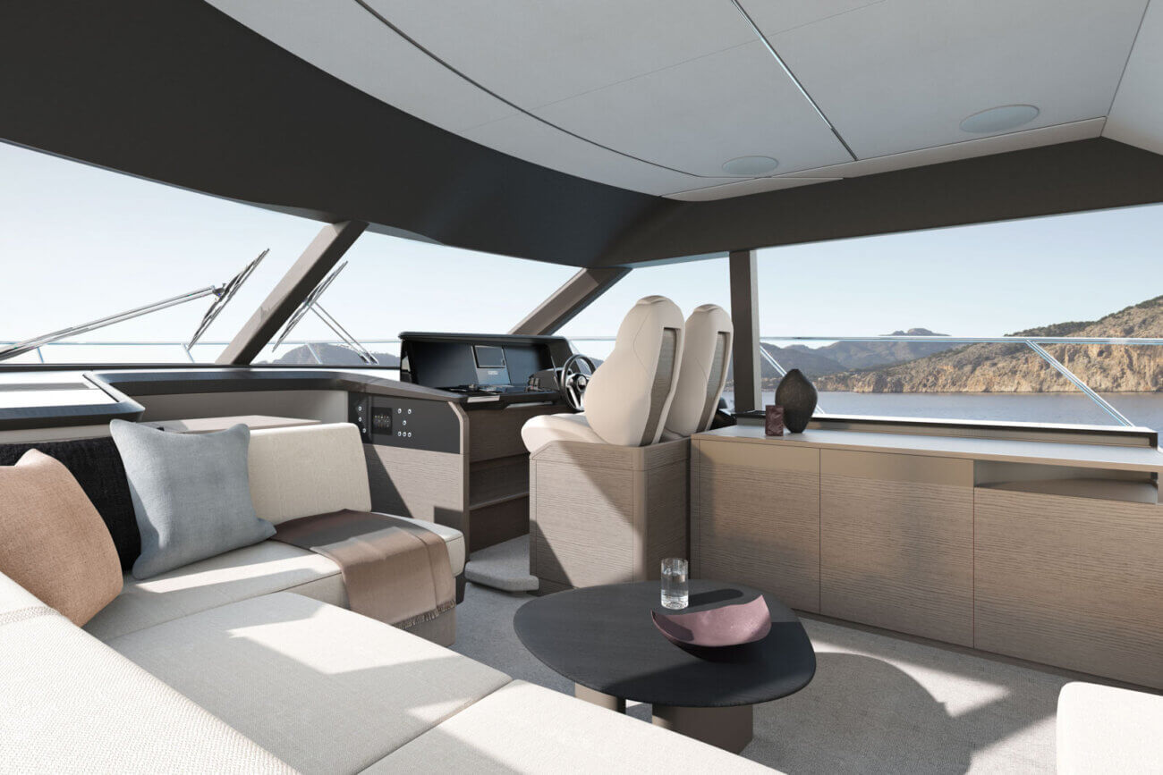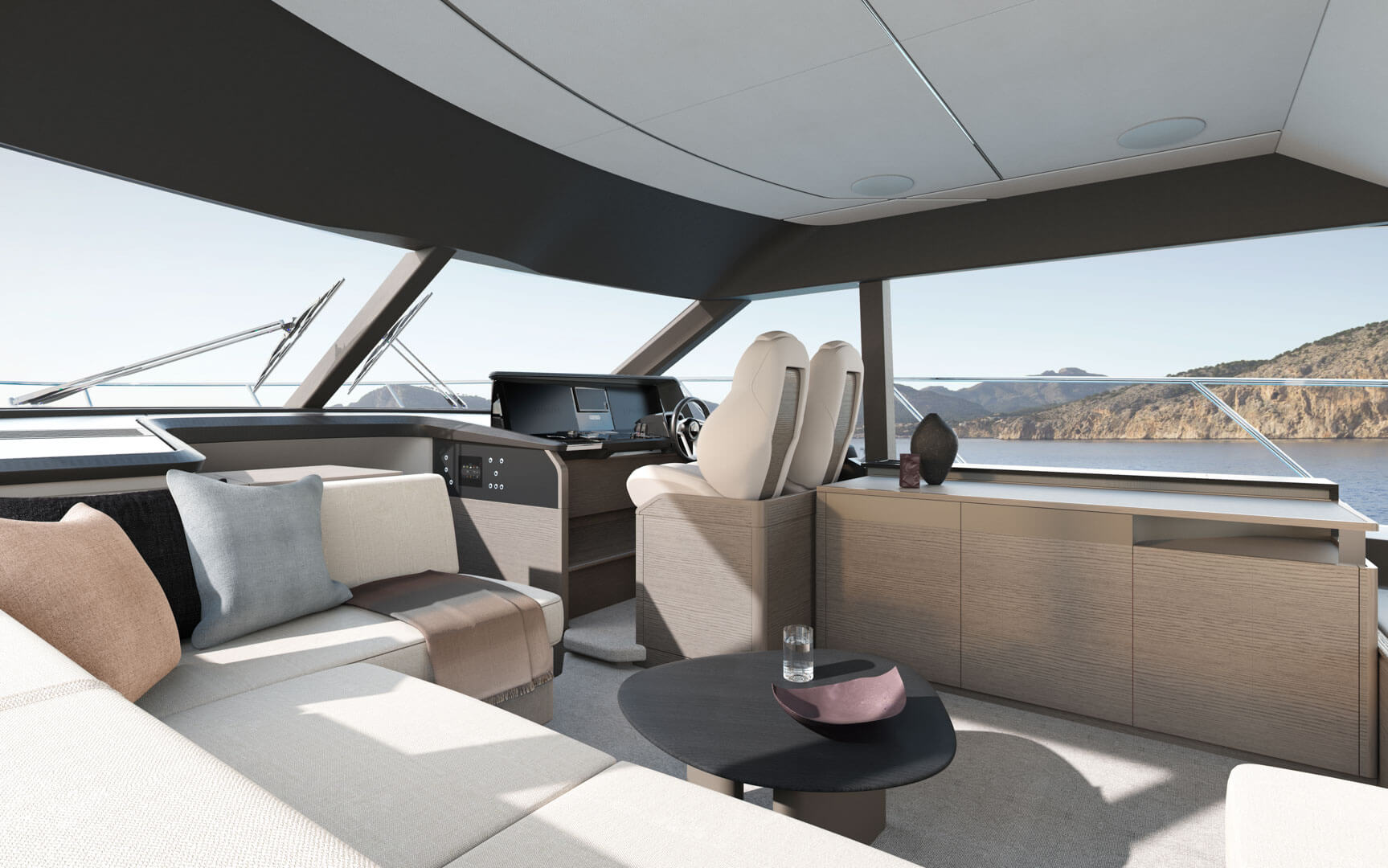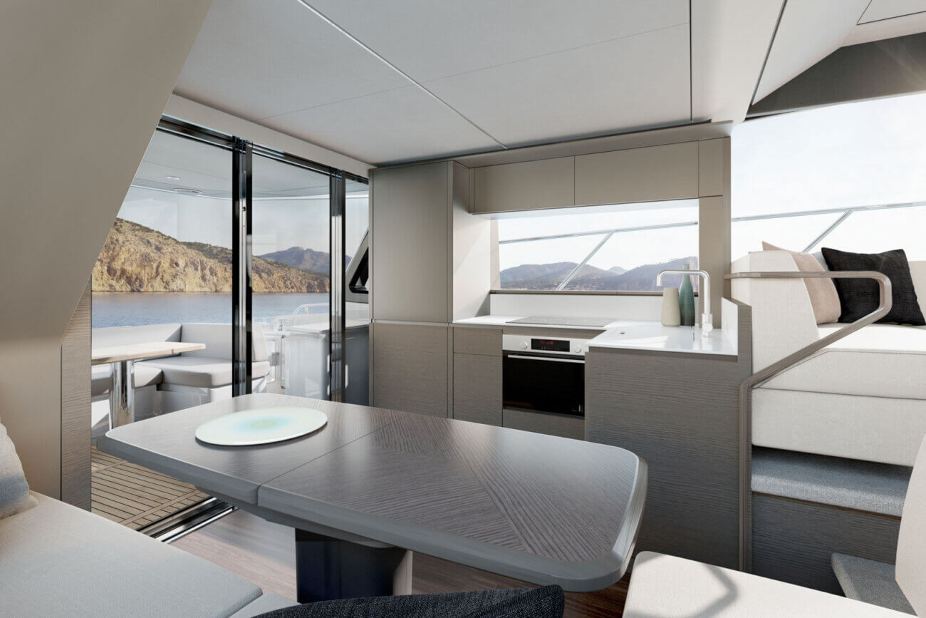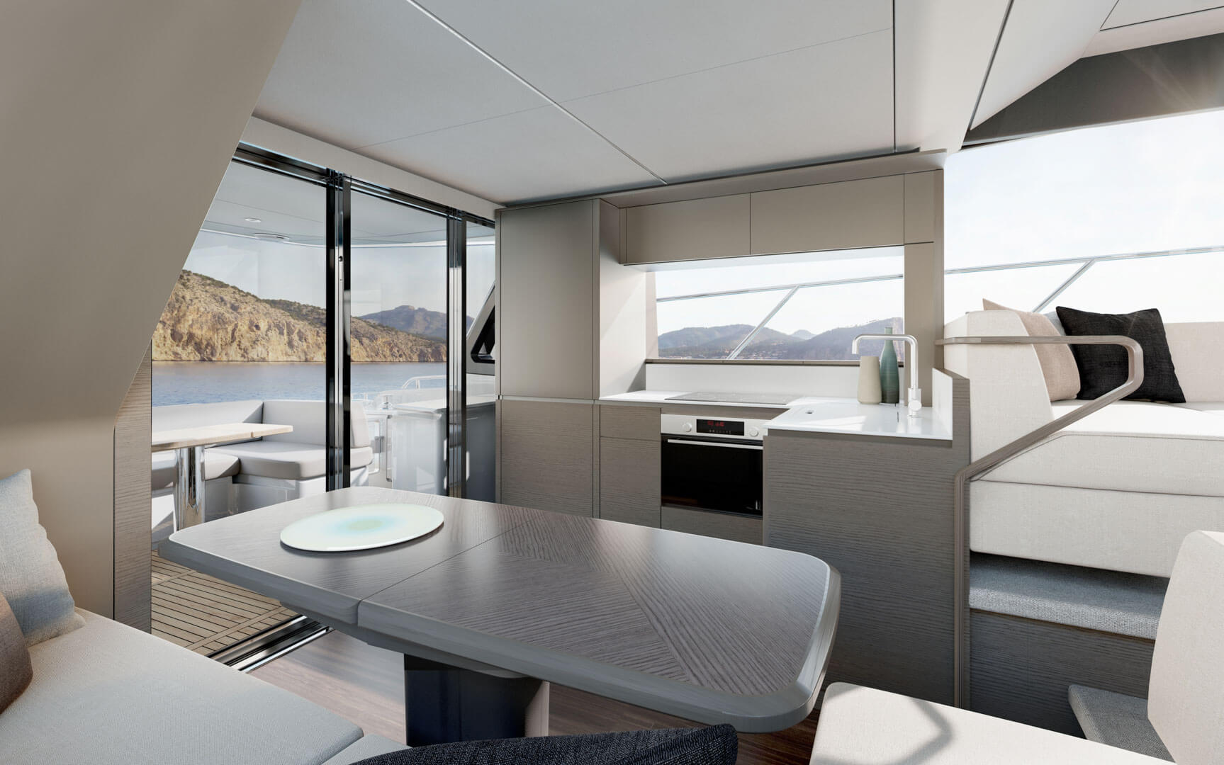 The redesigned flybridge offers versatile spaces for socialising, with a sunpad conversion, generous dining area, and the option of a fully equipped wetbar. For added comfort, an optional hardtop provides protection in all conditions. On the main deck, the aft galley layout with a dedicated dinette enhances the sense of space and connection, seamlessly linking the cockpit with the light-filled saloon.