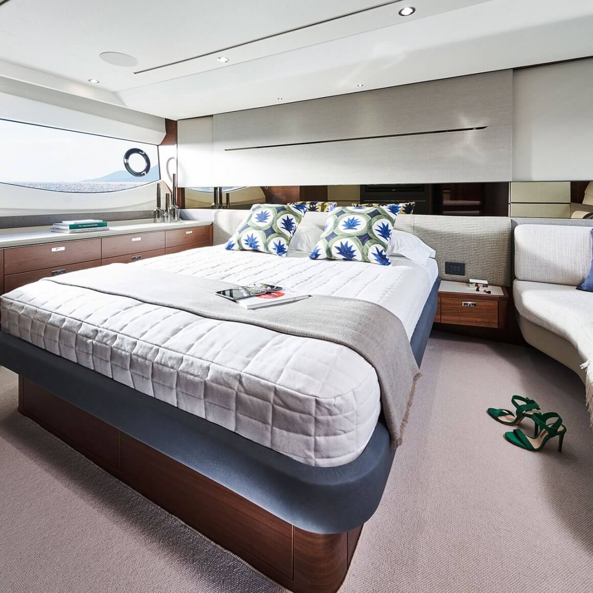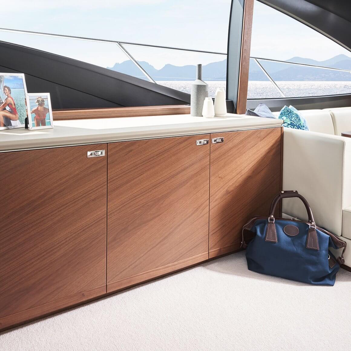 Powerful yet elegant, the new S62’s sleek exterior styling presents a dynamic, agile stance. With an optimised hull form spearheading her efficiency, her MAN V8 1200 engines mean you can experience speeds up to 38 knots. When at anchor her electro-hydraulic bathing platform creates a convenient launch system for a 3.3m tender, a jet ski, or simply a secluded swimming platform. Her sociable galley aft arrangement features an open-plan dining area with sliding doors and a fully opening window leading out to the cockpit. Below deck, six guests are comfortably accommodated across an en suite full-beam owner’s stateroom and two further guest cabins with the option of an additional crew cabin aft.