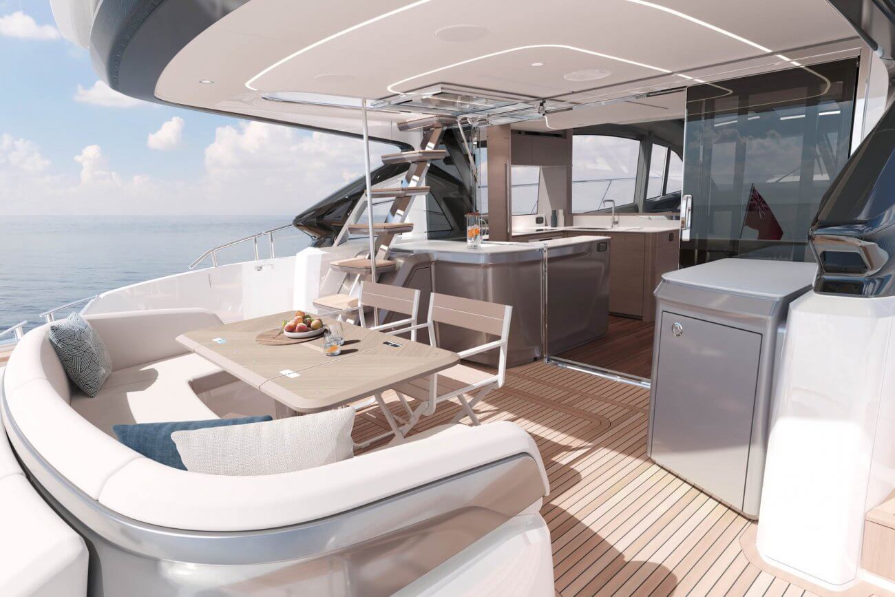 The sportsbridge offers modular seating areas with the option to adapt the space via a moveable backrest to offer a forward sunbed with storage below. The main deck flows from outside to in, with large hull length windows, sliding doors aft, an electrically sliding roof and cockpit connecting the wetbar to the interior galley.