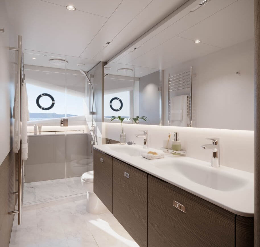 Below deck, eight guests enjoy four beautifully appointed cabins, three of which are en-suite, all bathed in natural light from elegant hull glazing, with a further twin cabin with en-suite aft for occasional guests or crew. A dedicated staircase leads from the main deck to the full-beam owner’s stateroom amidships, via a private lobby area in the lower.