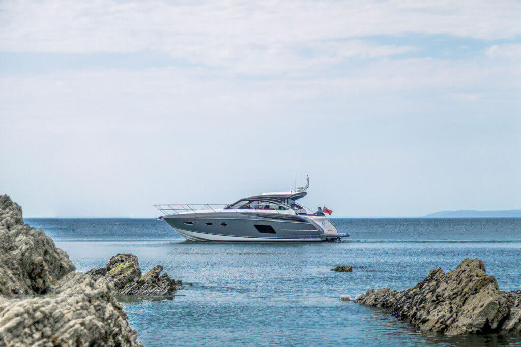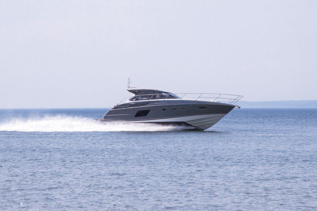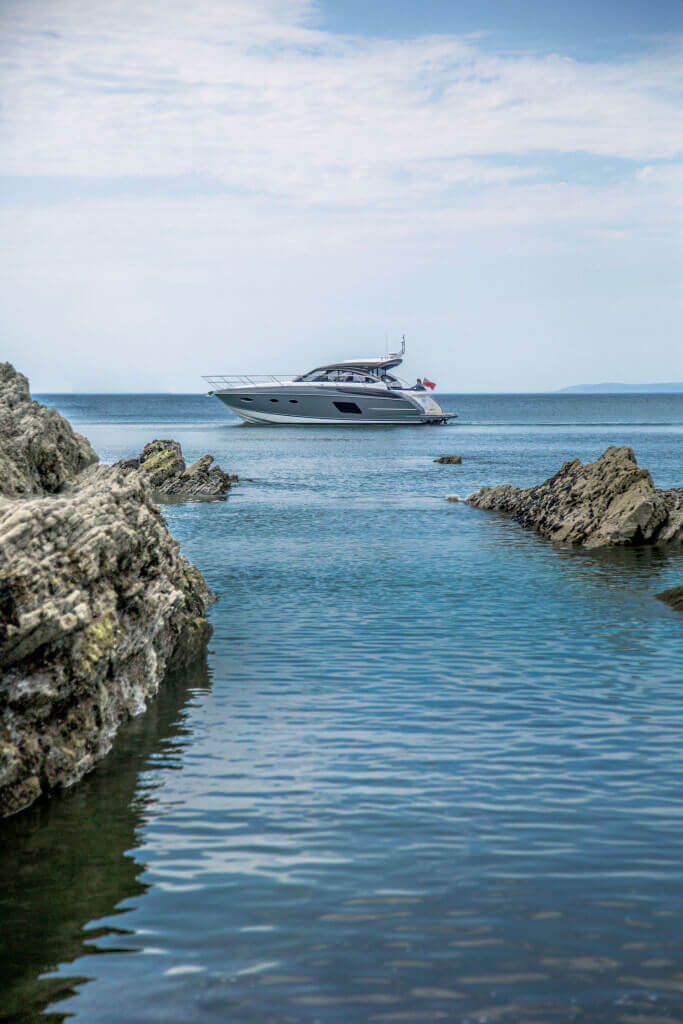 Princess’ new V48 introduces a fully enclosed deck saloon with hydraulic sliding roof to the sub fifty foot sport yacht genre. And it’s no less class leading down below with an incredible full beam master cabin amidships. Featuring the very latest IPS drive technology and resin infusion construction, this is the white hot edge of design engineering. If you are new to boating, then this IPS boat could be just right. The V48 is extremely easy to drive (this boat has twin Volvo IPS600s with 435hp each), whether you are sliding sideways around a marina or cruising effortlessly at sea. With an extremely comfortable driving position, the V48 shows exemplary performance. It is fast enough and has a wide range of cruising speeds between 22 and 28 knots.