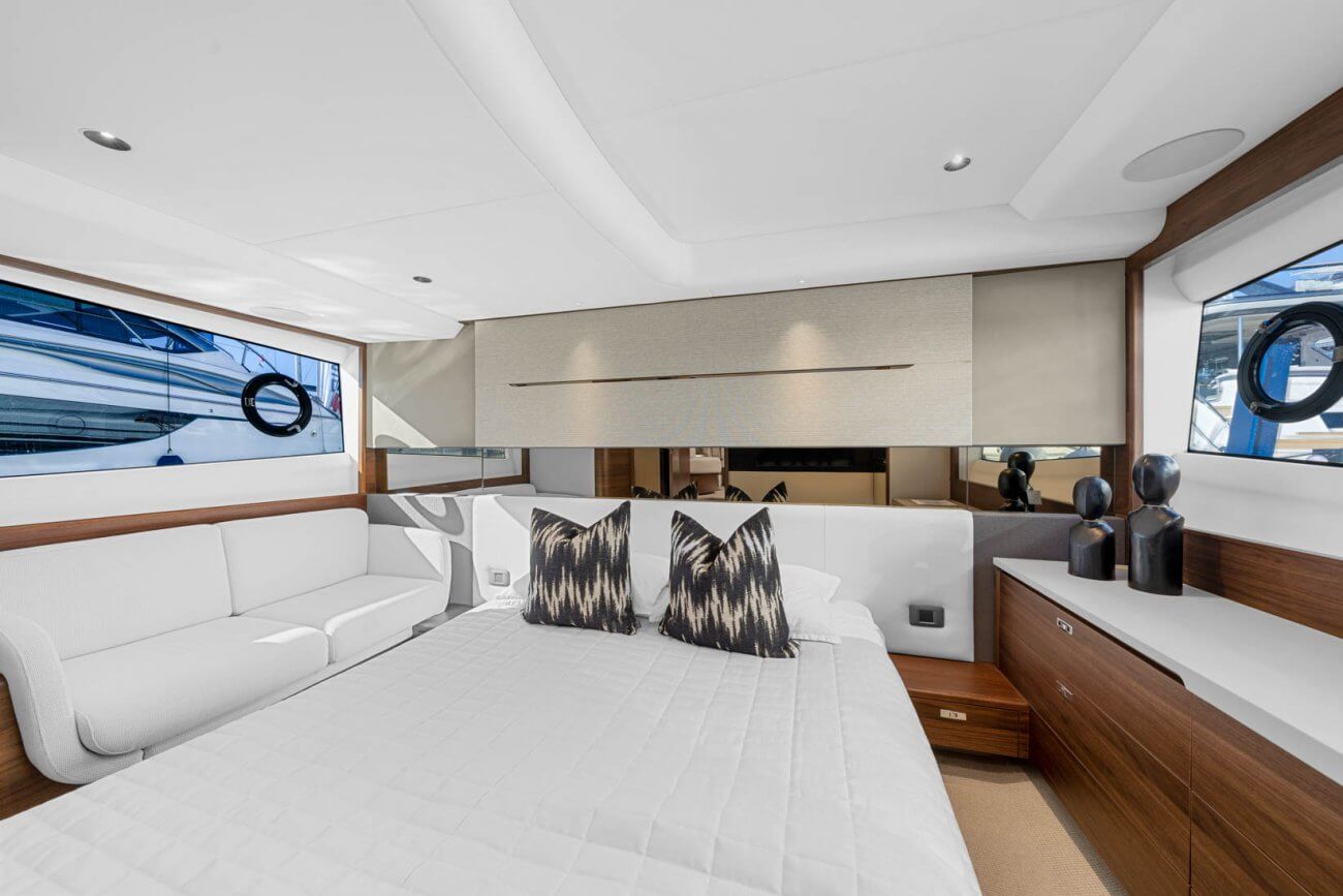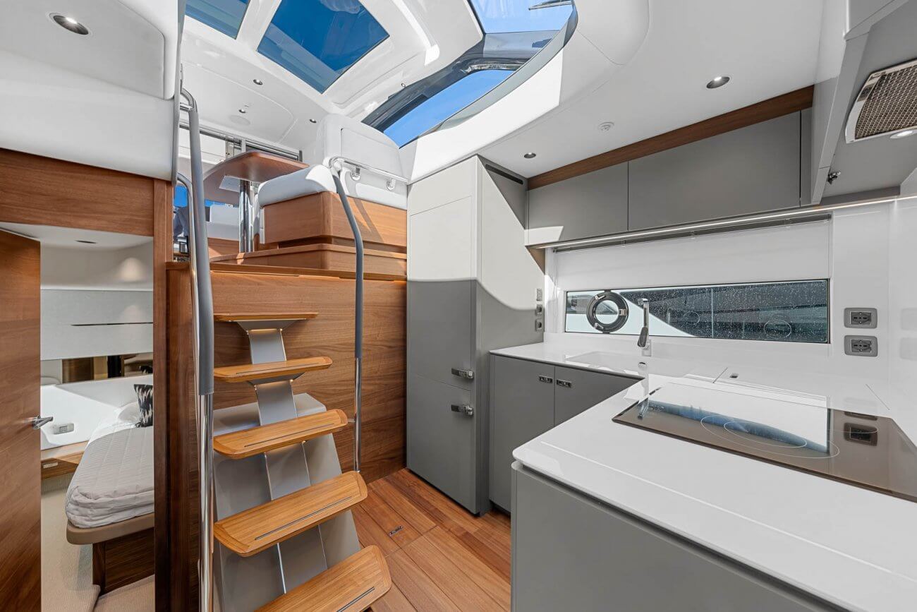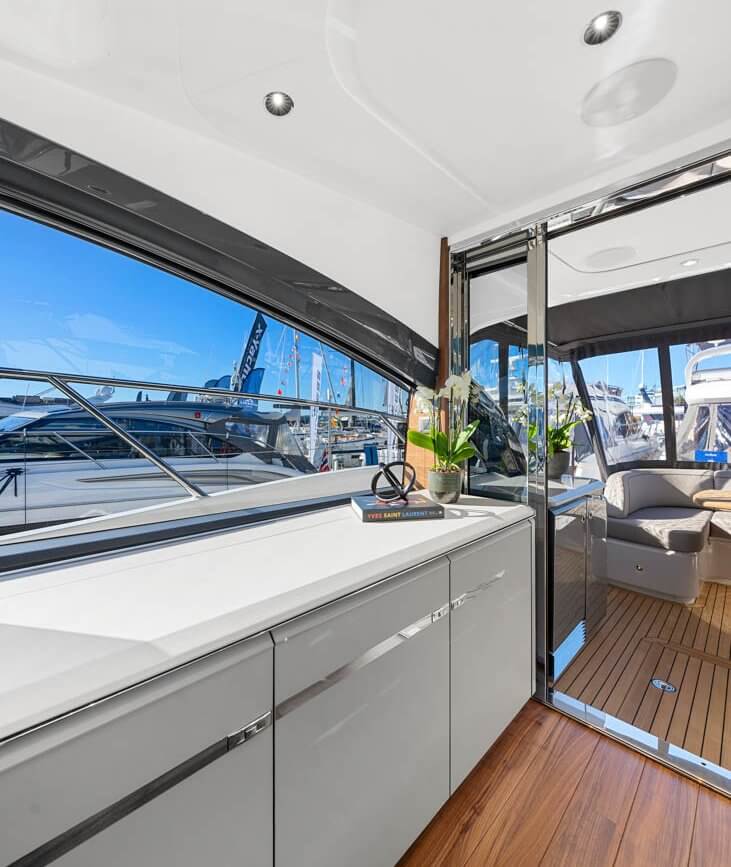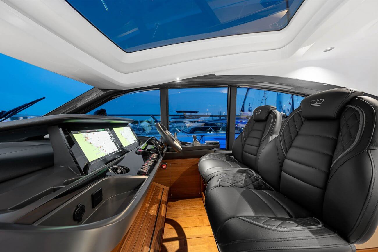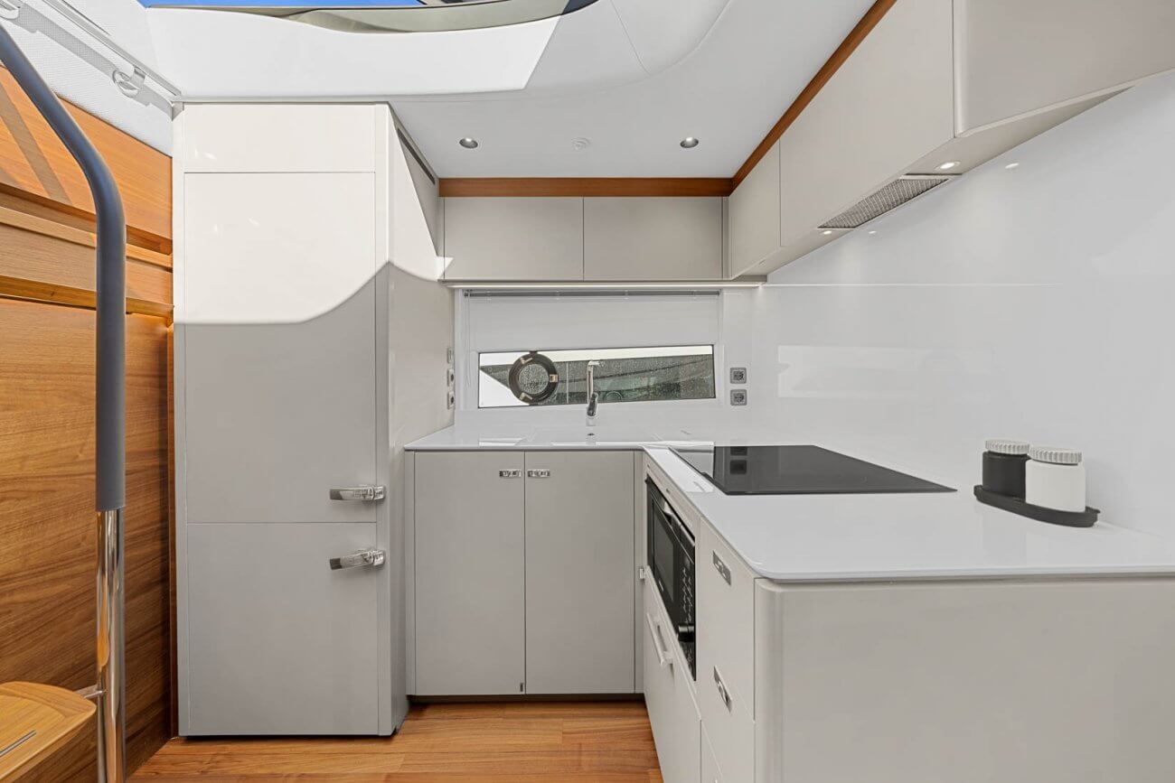 When entertaining, the extended cockpit provides exceptional outdoor living space in which to create unforgettable experiences. The elongated canopy provides a shaded area to escape the heat of the sun whilst being in a position to fully appreciate the yacht’s balanced performance. Below deck, a bright, modern open galley sits opposite a sociable entertaining space. Four guests can enjoy two beautifully appointed cabins that are filled with natural light from the extensive hull glazing, with a full-beam master stateroom situated amidships.