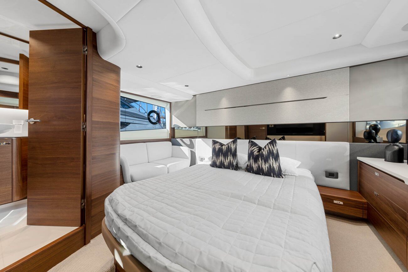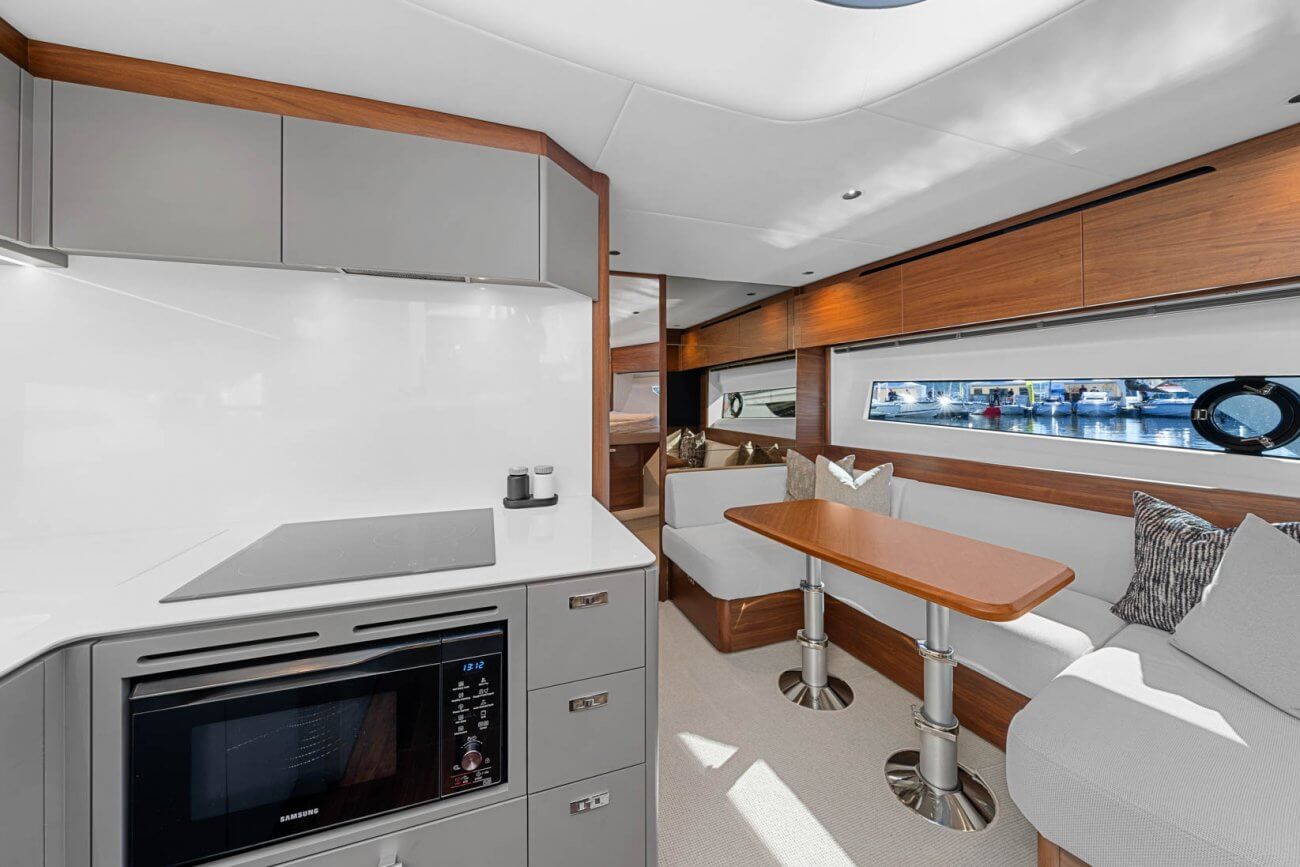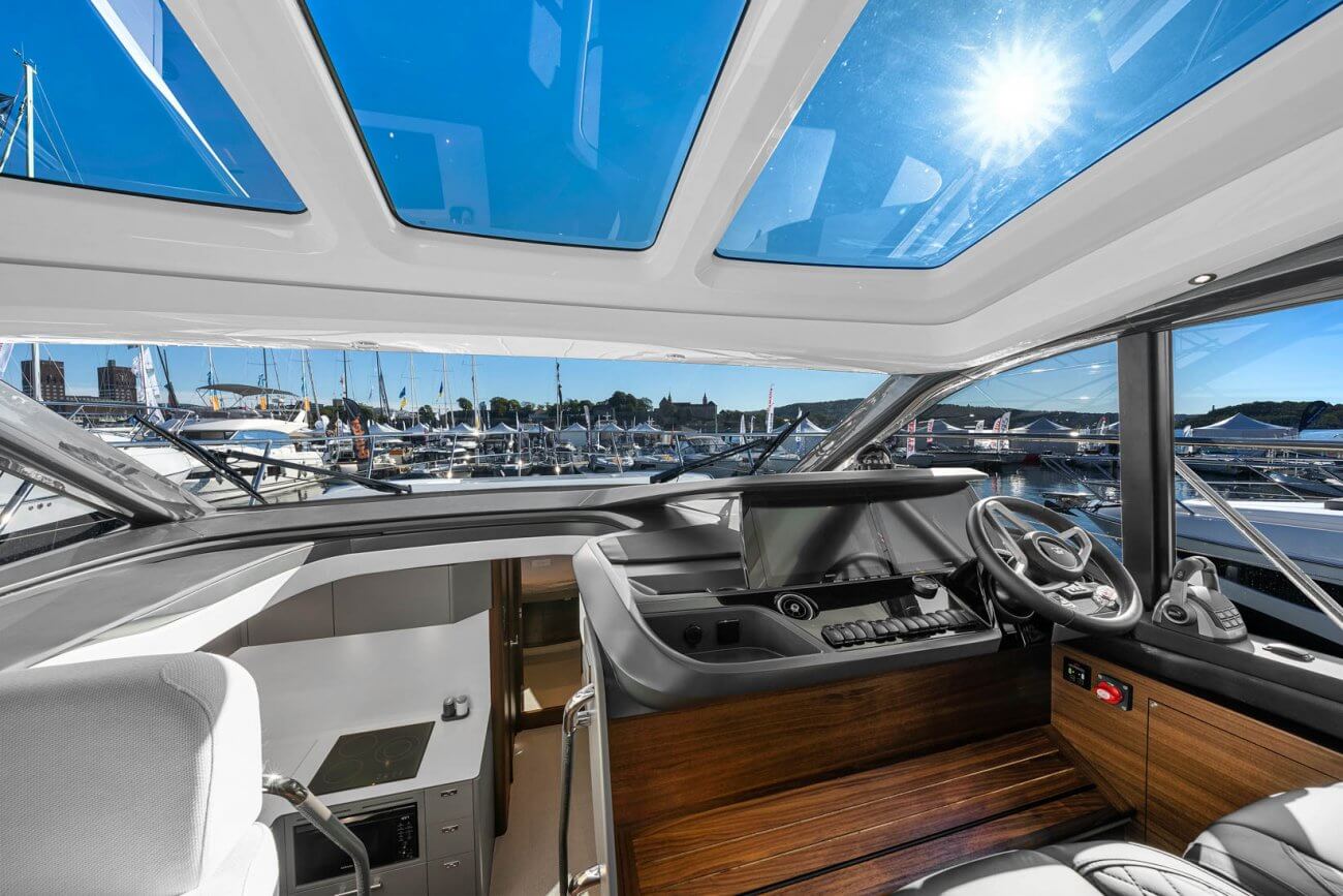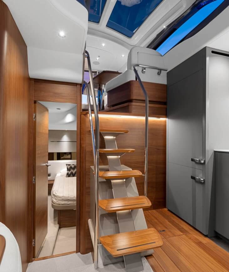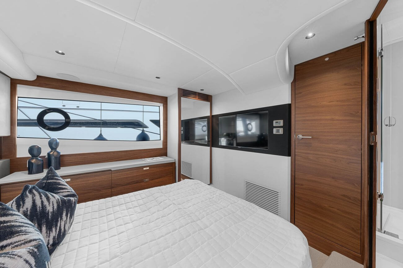 When entertaining, the extended cockpit provides exceptional outdoor living space in which to create unforgettable experiences. The elongated canopy provides a shaded area to escape the heat of the sun whilst being in a position to fully appreciate the yacht’s balanced performance. Below deck, a bright, modern open galley sits opposite a sociable entertaining space. Four guests can enjoy two beautifully appointed cabins that are filled with natural light from the extensive hull glazing, with a full-beam master stateroom situated amidships.