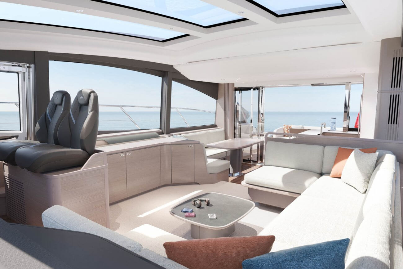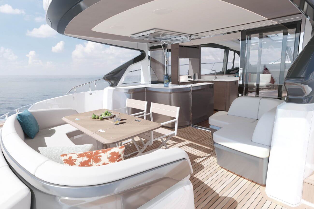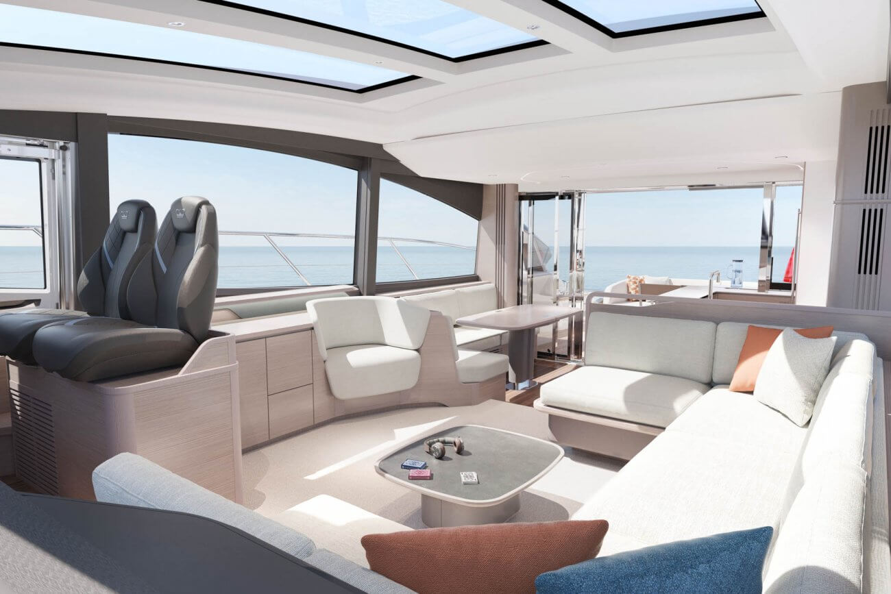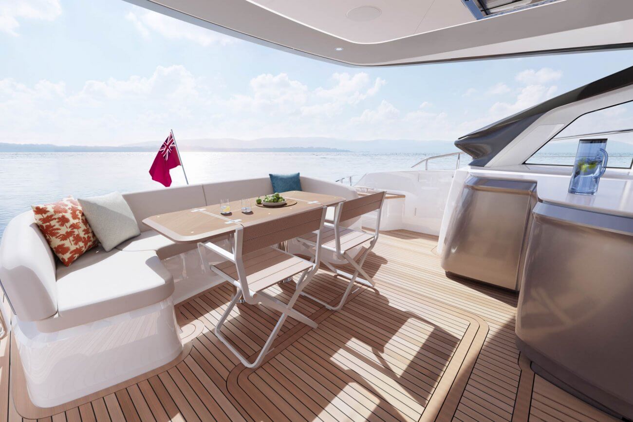 The all-new V65 sets a new standard. Powerful and progressive, she represents the exciting future of the Princess V Class range. When entertaining, her spacious cockpit inspires relaxation with a sunpad and well equipped dining area leading to the fully equipped aft galley. This flexible deck saloon model can be climate controlled or opened to the elements via triple sliding aft doors and a retractable sunroof. Below deck, eight guests enjoy four beautifully appointed cabins all bathed in natural light from elegant hull glazing, with the option of a further single cabin aft for occasional guests or crew.
