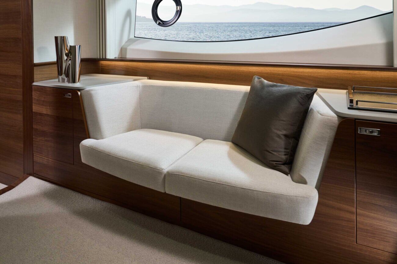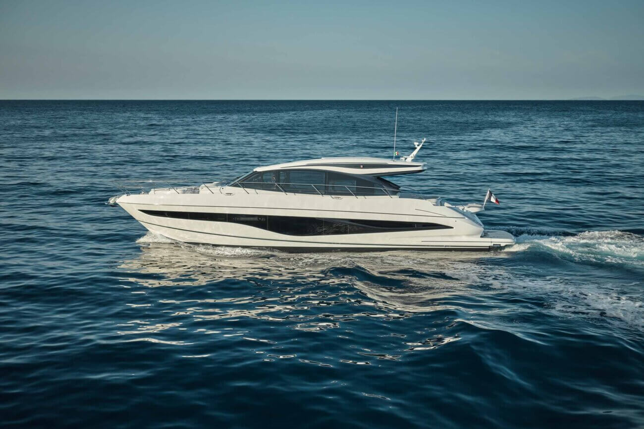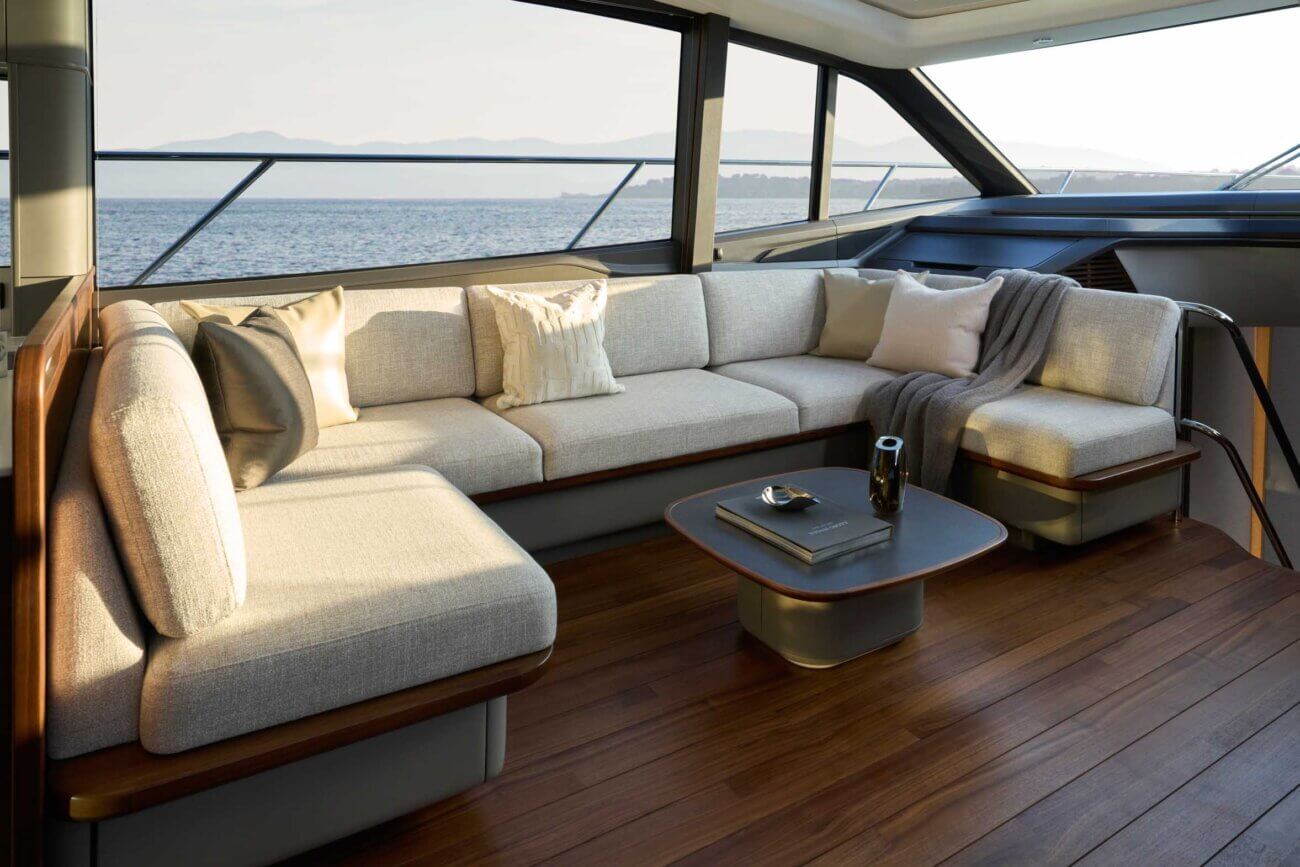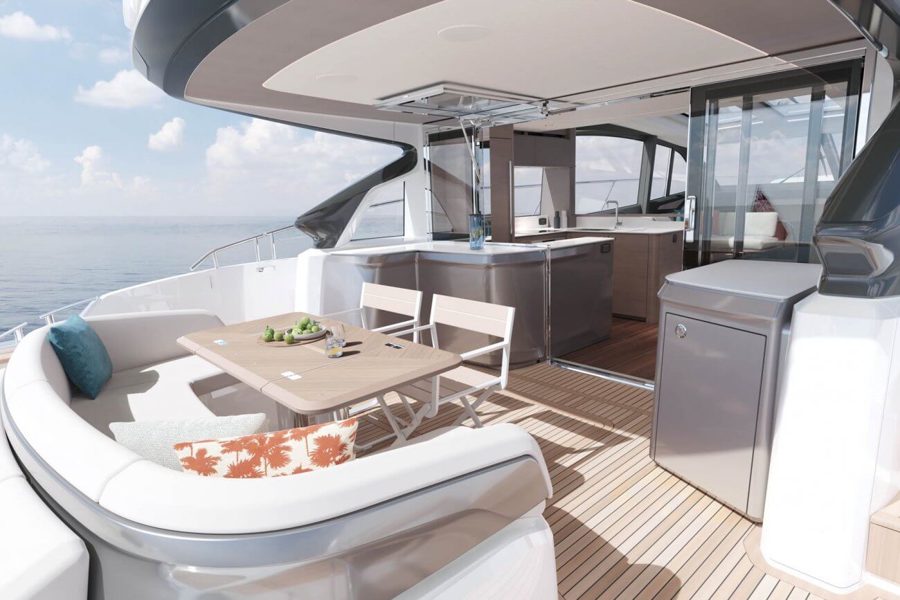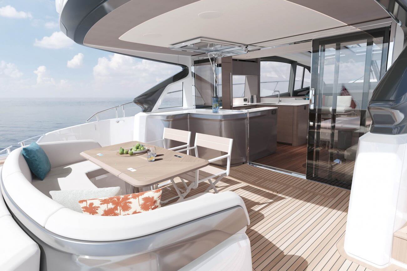 The all-new V65 sets a new standard. Powerful and progressive, she represents the exciting future of the Princess V Class range. When entertaining, her spacious cockpit inspires relaxation with a sunpad and well equipped dining area leading to the fully equipped aft galley. This flexible deck saloon model can be climate controlled or opened to the elements via triple sliding aft doors and a retractable sunroof. Below deck, eight guests enjoy four beautifully appointed cabins all bathed in natural light from elegant hull glazing, with the option of a further single cabin aft for occasional guests or crew.