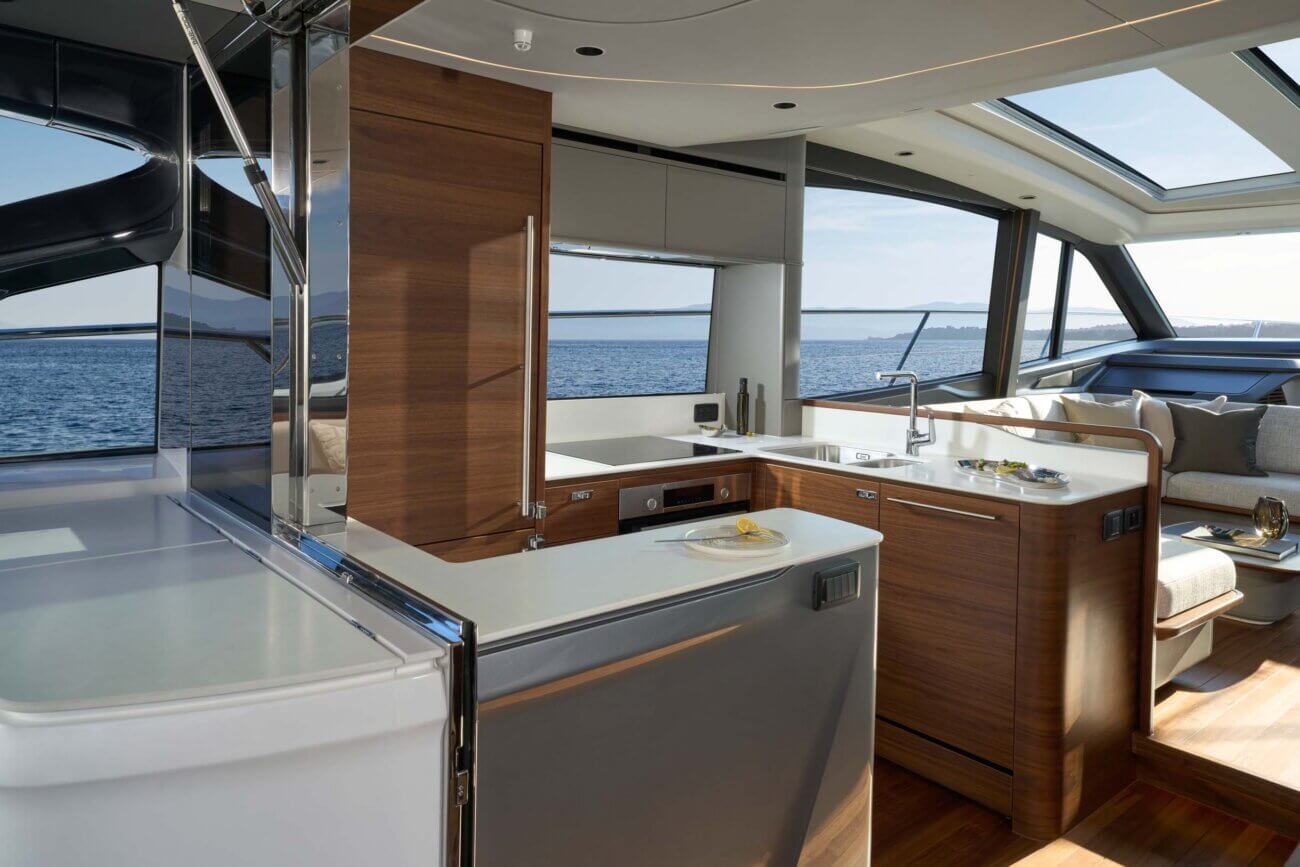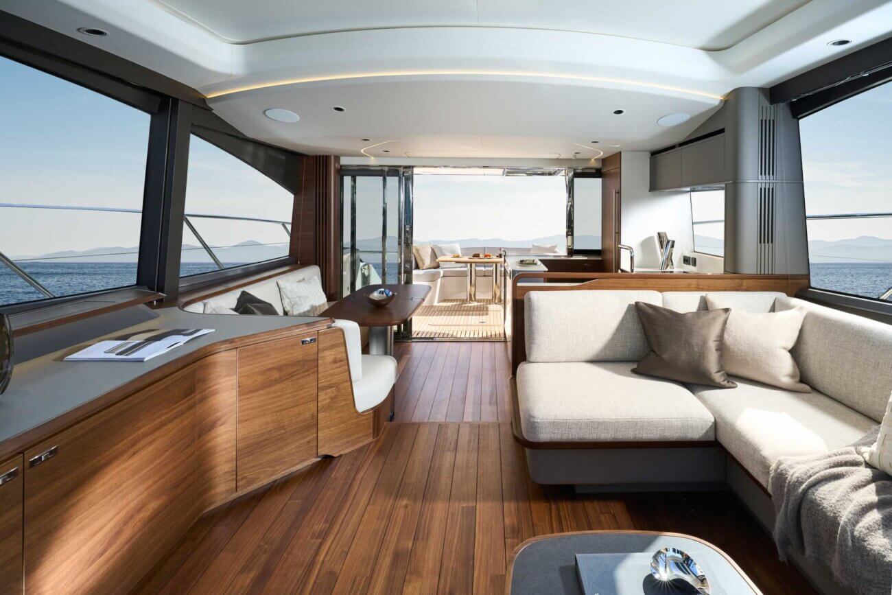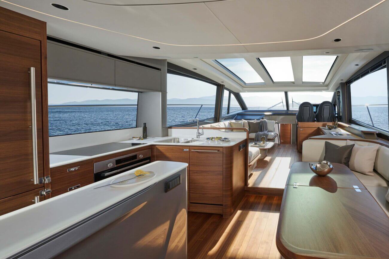• Timber-laid floor to galley, dining area, forward saloon and helm position