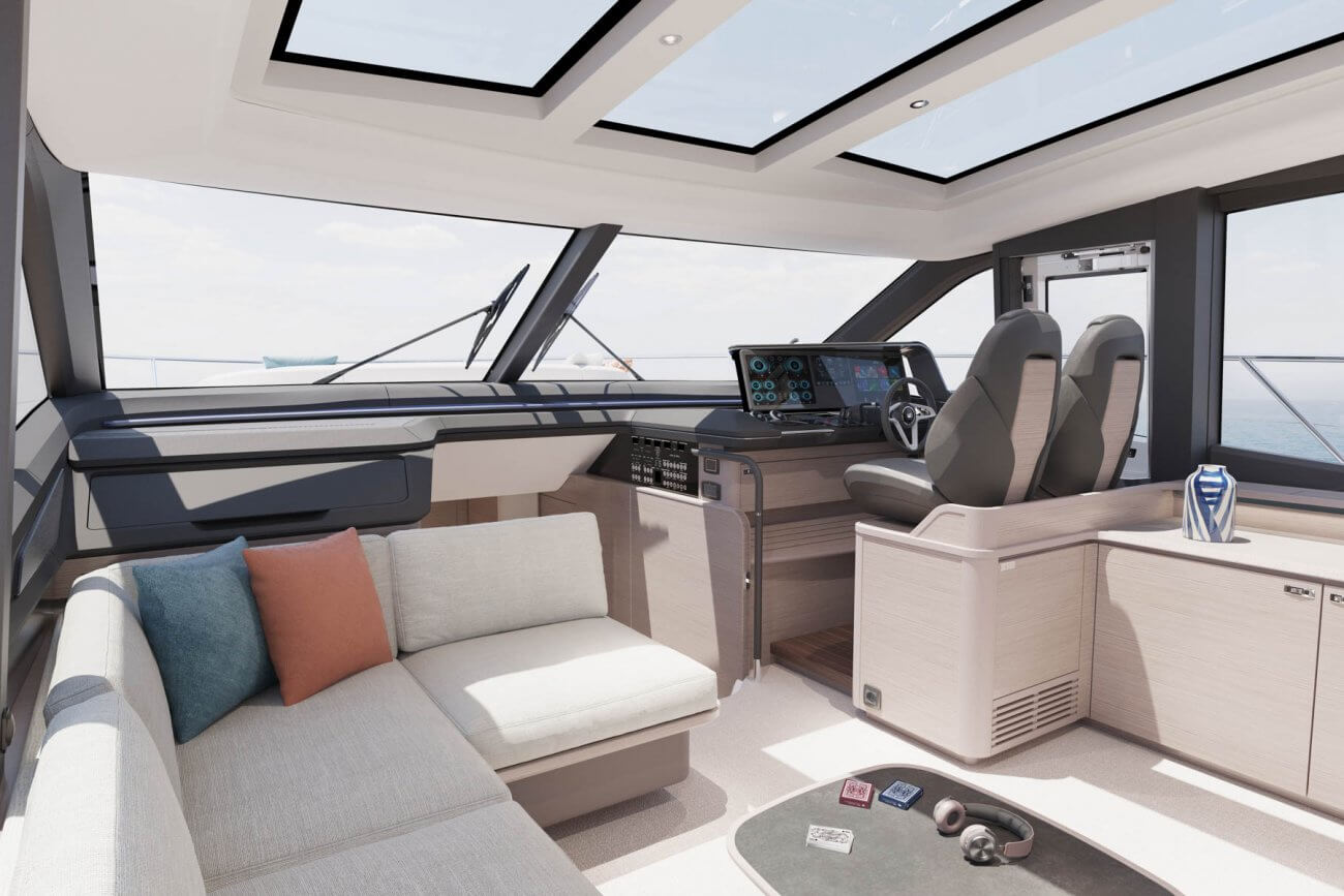 • Twin helm seats with fore and aft adjustment and flip seat for helmsman