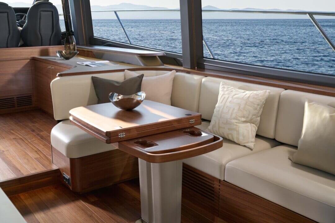 • Timber-laid floor to galley, dining area, forward saloon and helm position