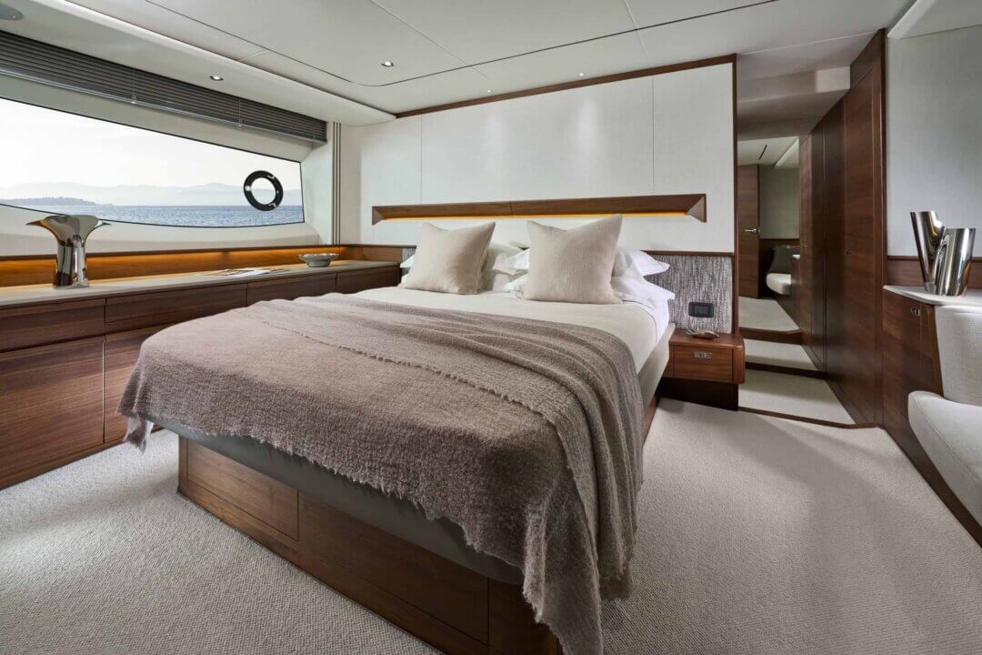 The all-new V65 sets a new standard. Powerful and progressive, she represents the exciting future of the Princess V Class range. When entertaining, her spacious cockpit inspires relaxation with a sunpad and well equipped dining area leading to the fully equipped aft galley. This flexible deck saloon model can be climate controlled or opened to the elements via triple sliding aft doors and a retractable sunroof. Below deck, eight guests enjoy four beautifully appointed cabins all bathed in natural light from elegant hull glazing, with the option of a further single cabin aft for occasional guests or crew.