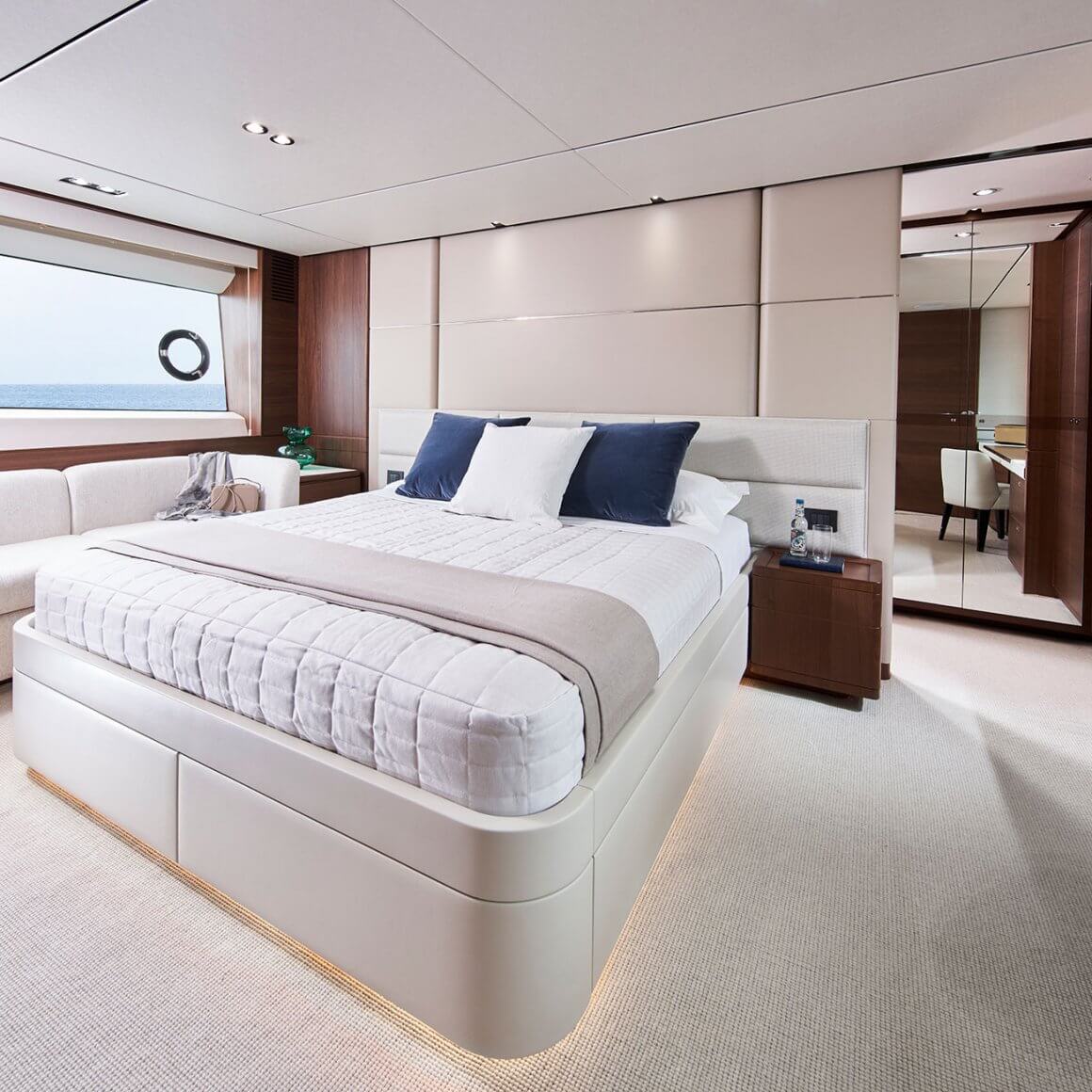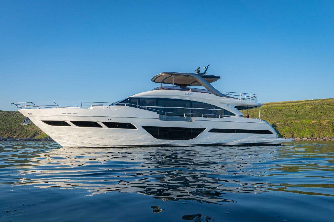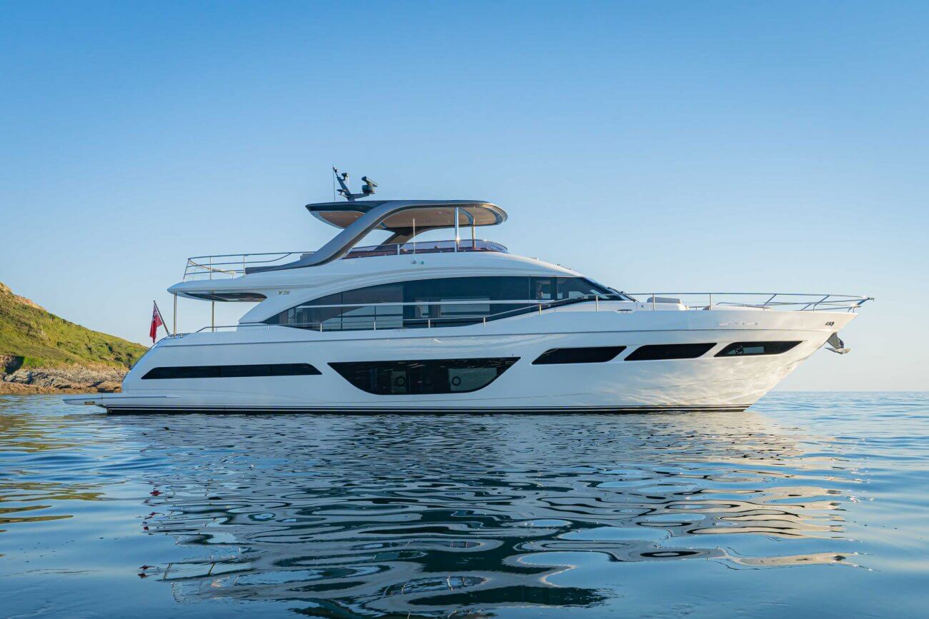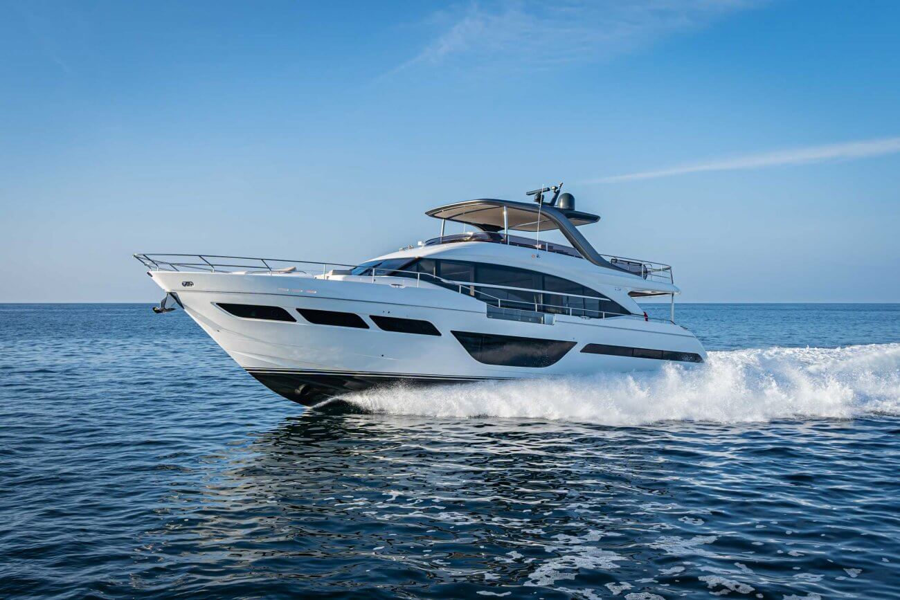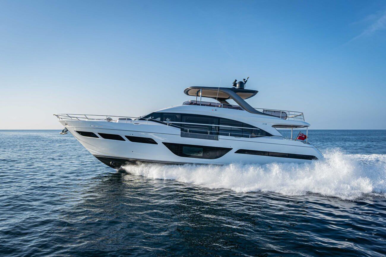 The new Y78 features the very latest in Princess exterior design and interior materials and finishes. Her flexible deck layout features a walkthrough foredeck with U-shaped seating and sunbathing area, whilst her flybridge aft has space for free standing furniture or can accommodate a crane and a tender. Natural light flows in to her main deck through extended window lines and a unique full-height window on the port side to make the free standing dining area a spectacular place to entertain. Forward on the lower deck, all three guest cabins are en suite whilst a dedicated staircase leads to the owner’s stateroom amidships via a private lobby area.