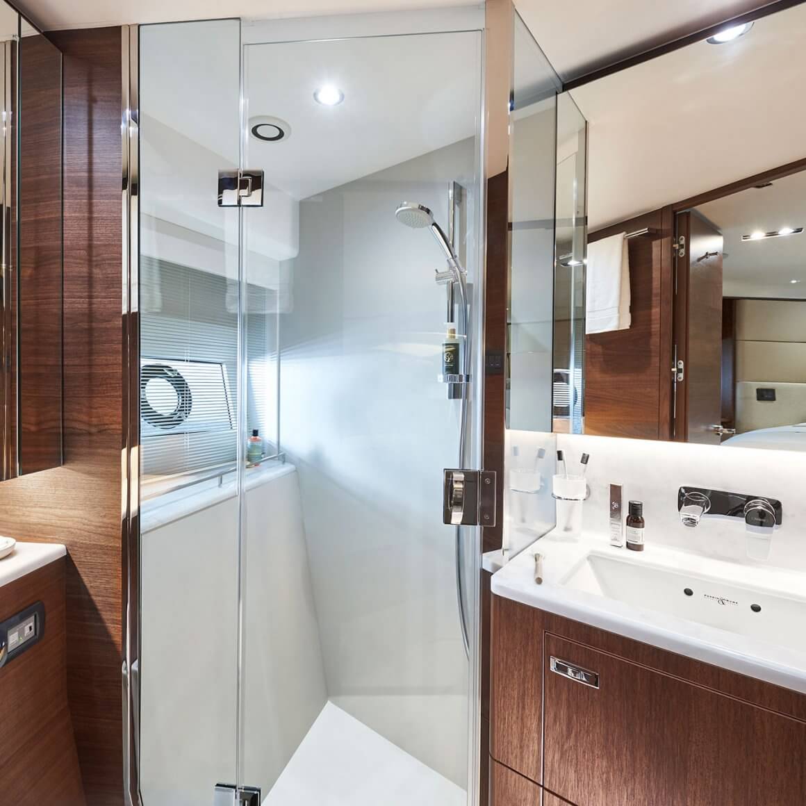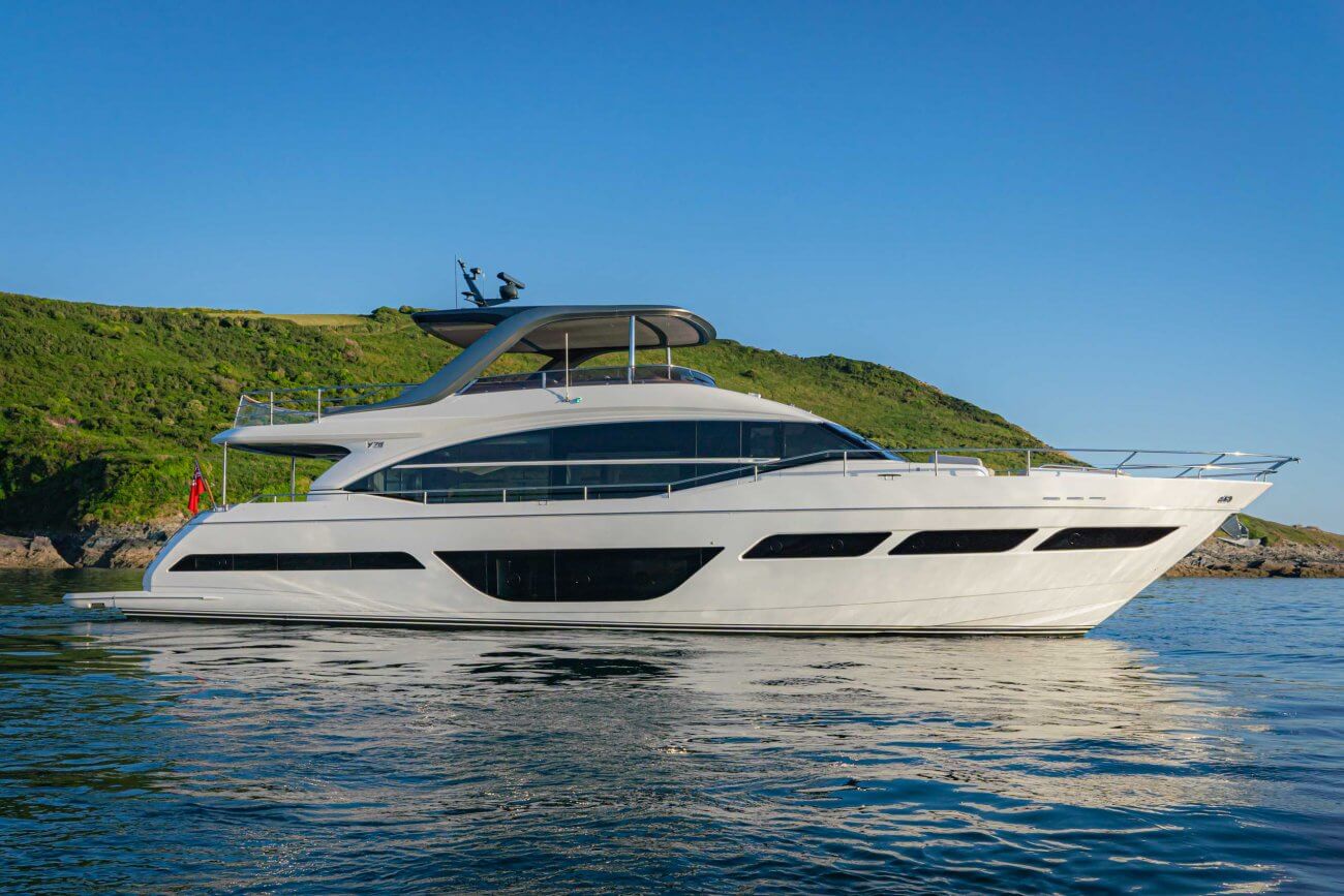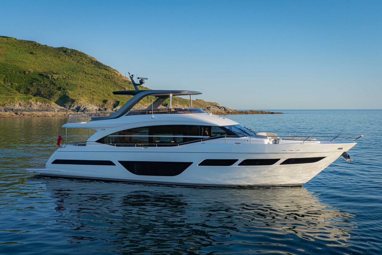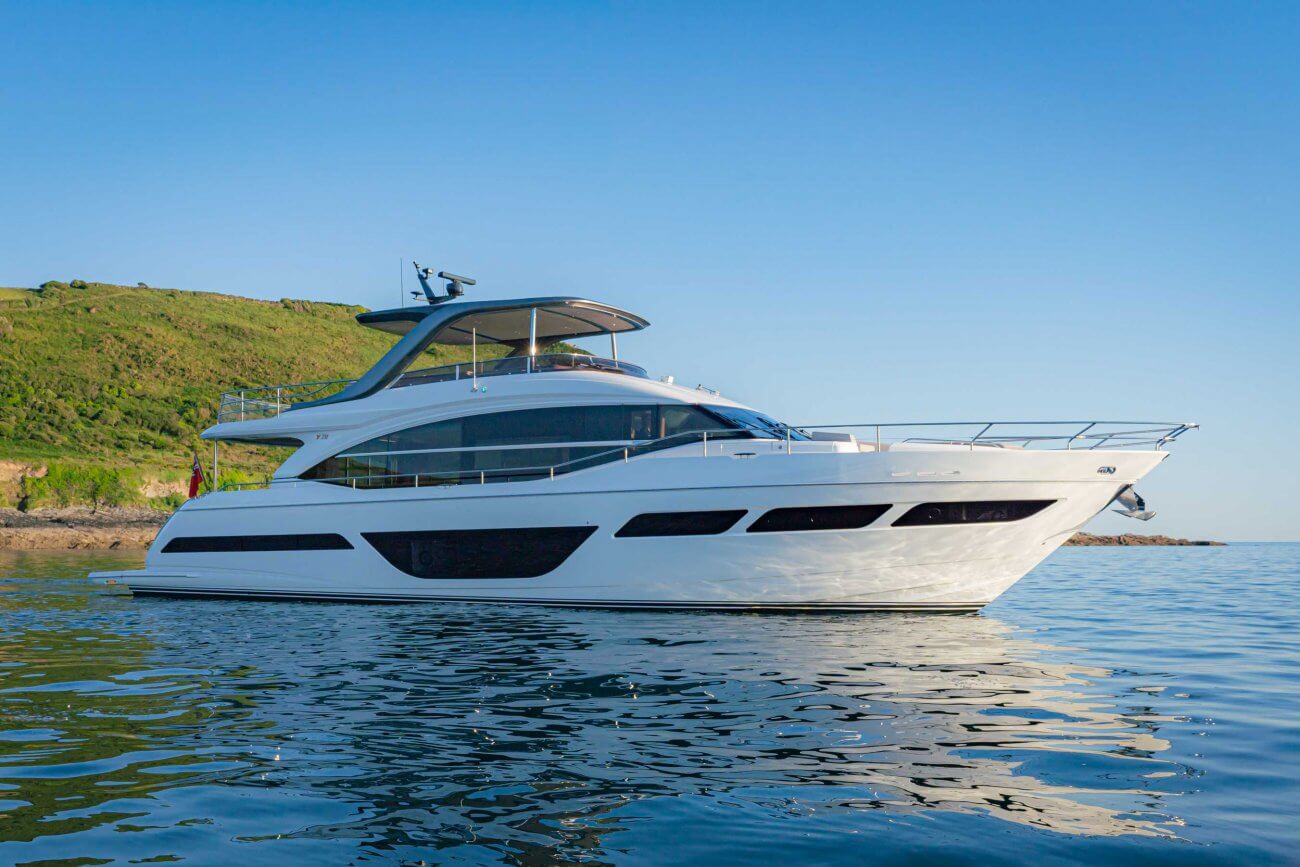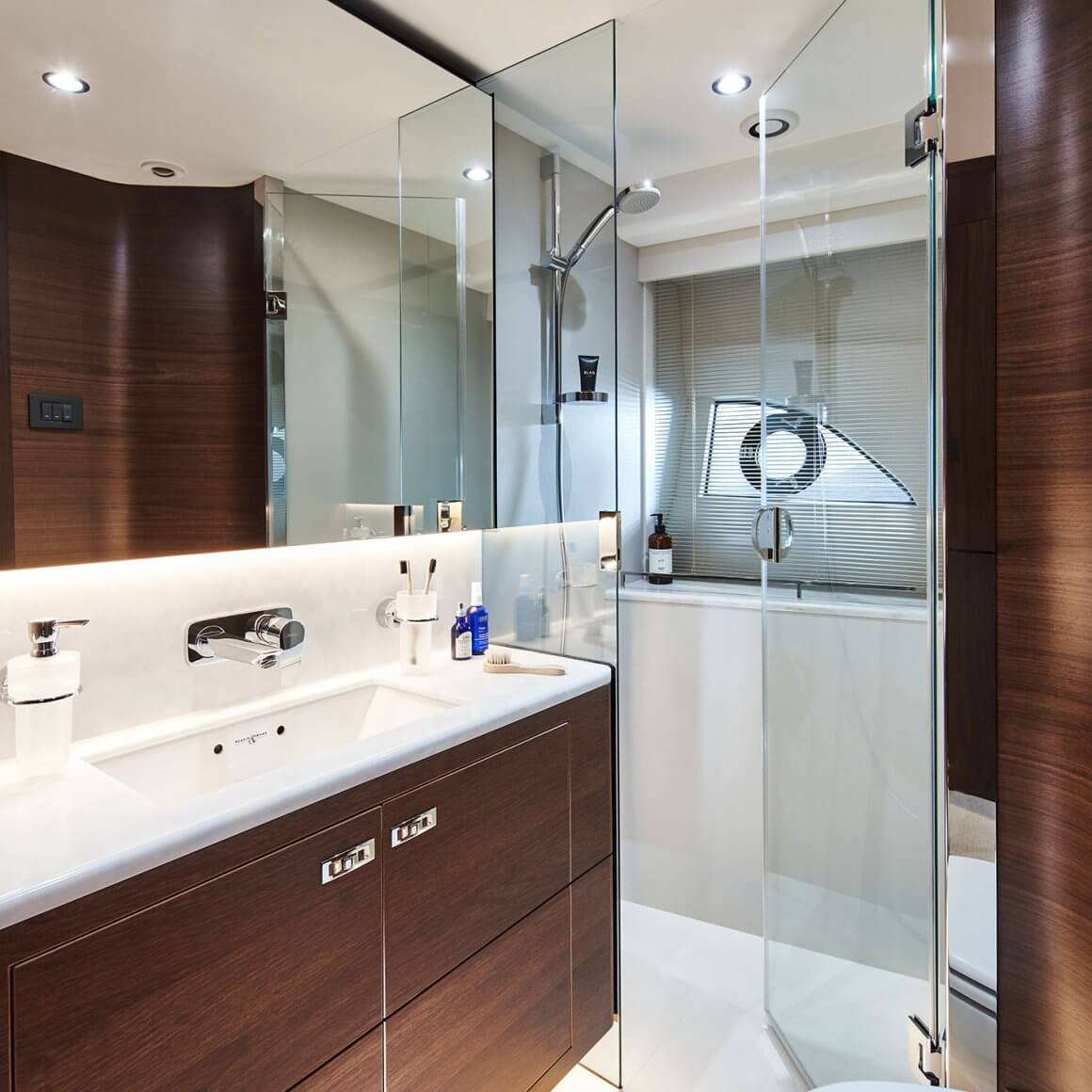 The new Y78 features the very latest in Princess exterior design and interior materials and finishes. Her flexible deck layout features a walkthrough foredeck with U-shaped seating and sunbathing area, whilst her flybridge aft has space for free standing furniture or can accommodate a crane and a tender. Natural light flows in to her main deck through extended window lines and a unique full-height window on the port side to make the free standing dining area a spectacular place to entertain. Forward on the lower deck, all three guest cabins are en suite whilst a dedicated staircase leads to the owner’s stateroom amidships via a private lobby area.