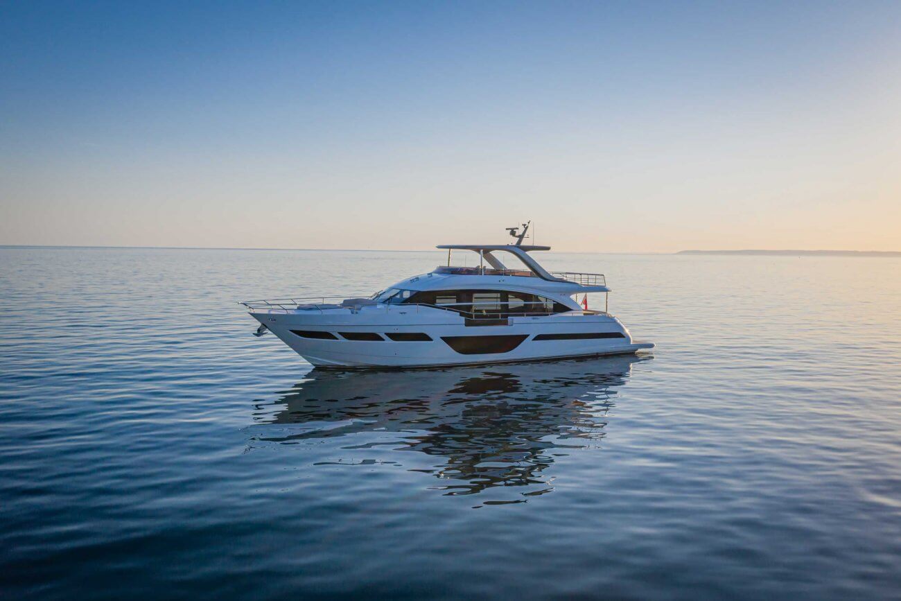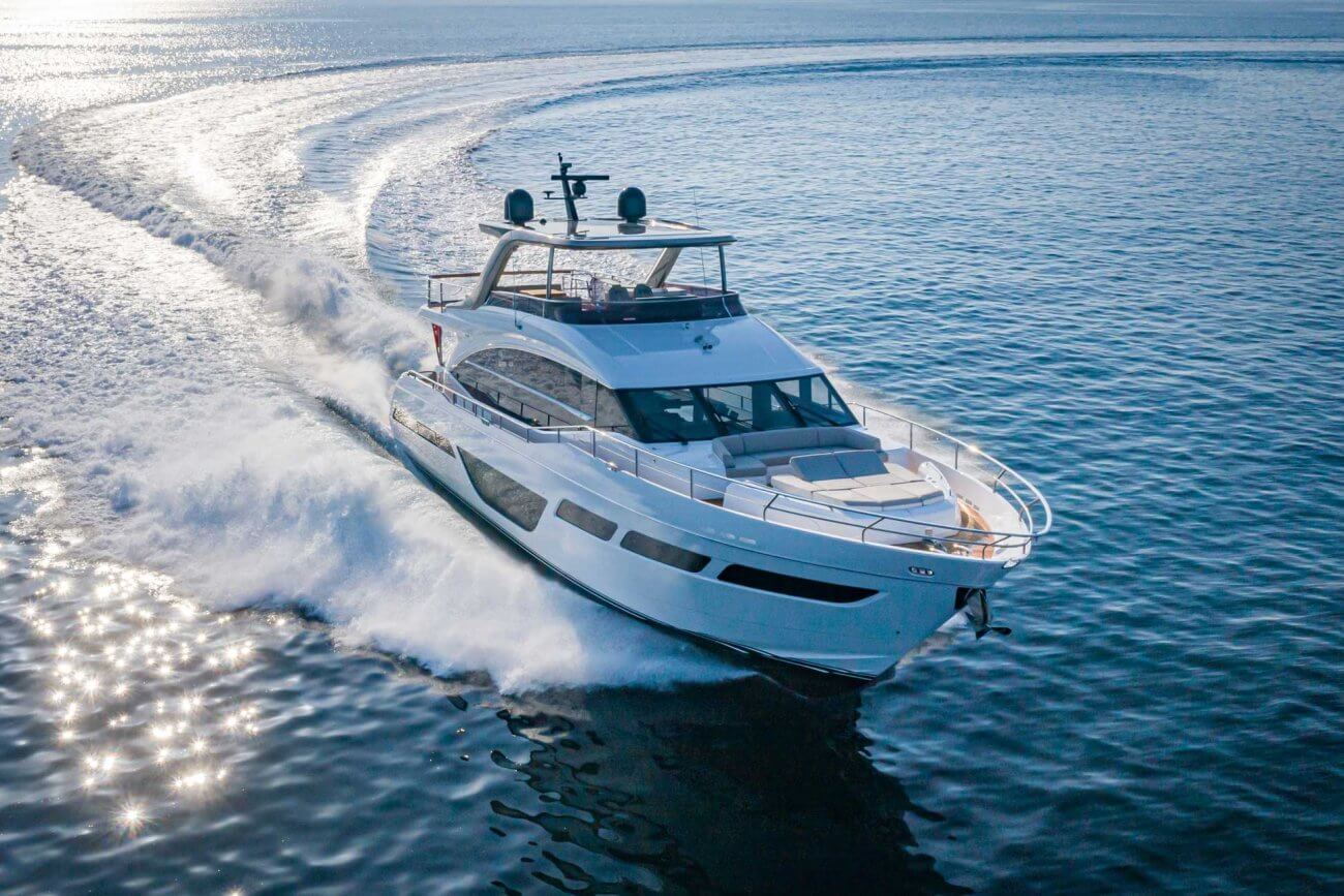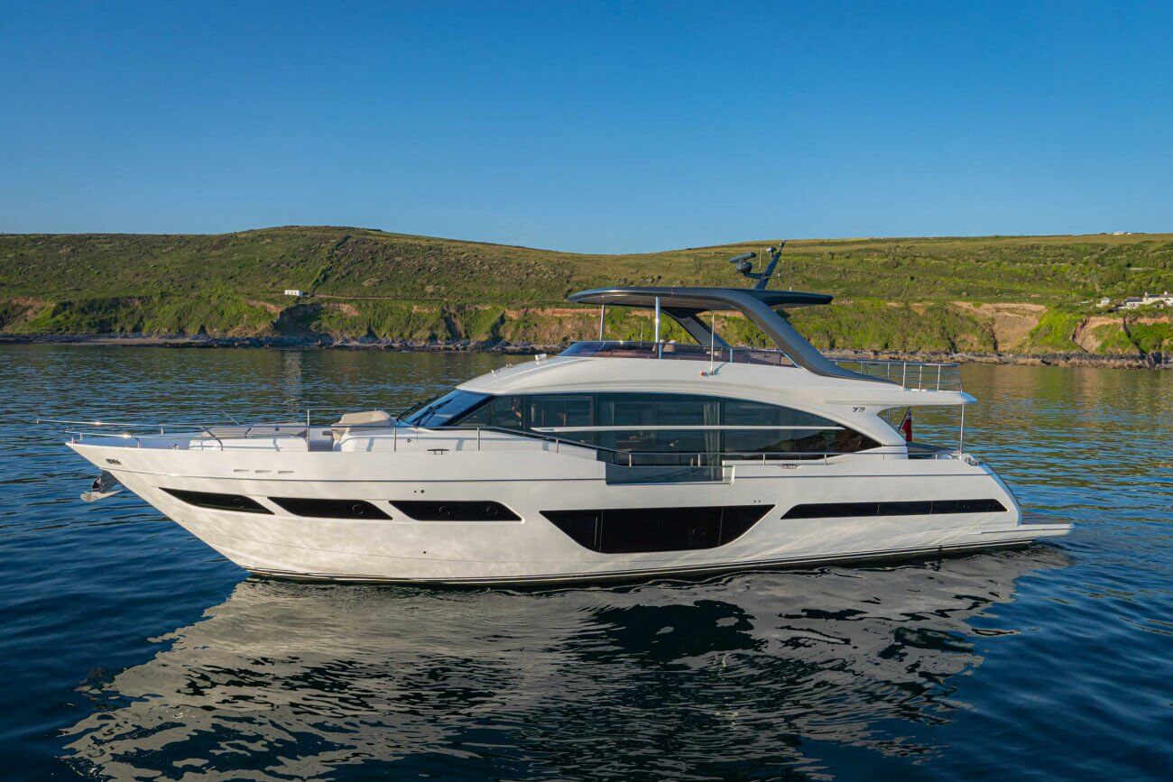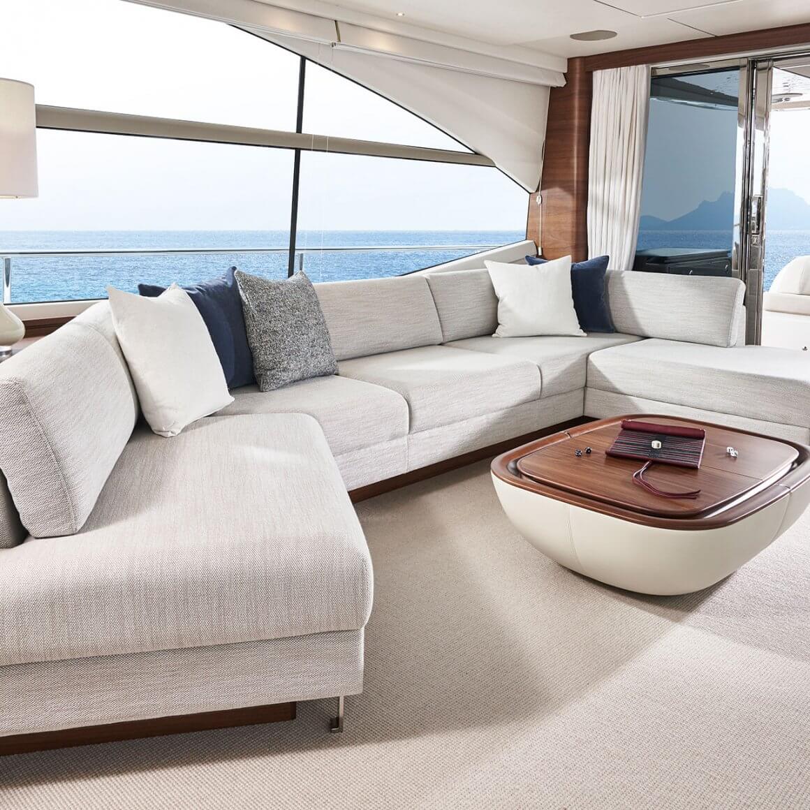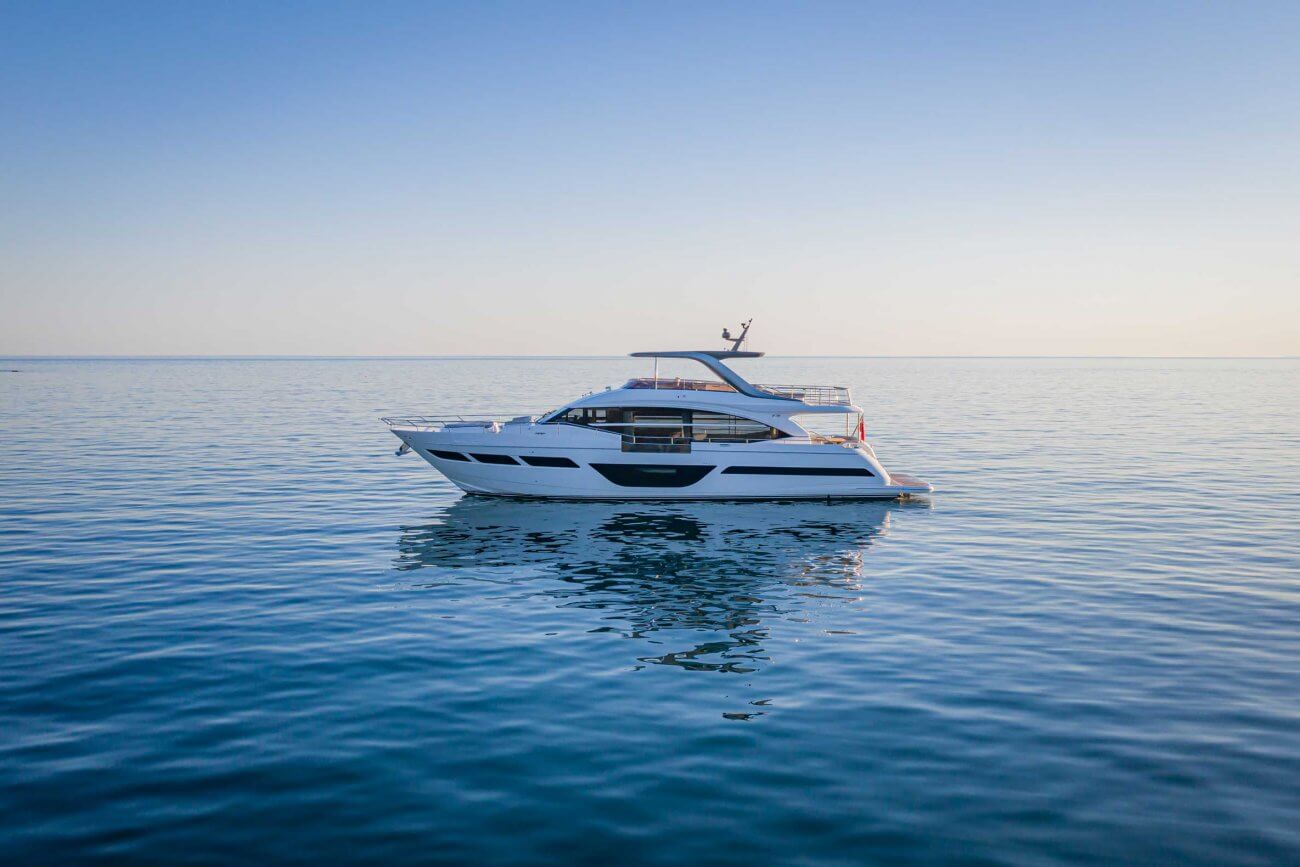 The new Y78 features the very latest in Princess exterior design and interior materials and finishes. Her flexible deck layout features a walkthrough foredeck with U-shaped seating and sunbathing area, whilst her flybridge aft has space for free standing furniture or can accommodate a crane and a tender. Natural light flows in to her main deck through extended window lines and a unique full-height window on the port side to make the free standing dining area a spectacular place to entertain. Forward on the lower deck, all three guest cabins are en suite whilst a dedicated staircase leads to the owner’s stateroom amidships via a private lobby area.