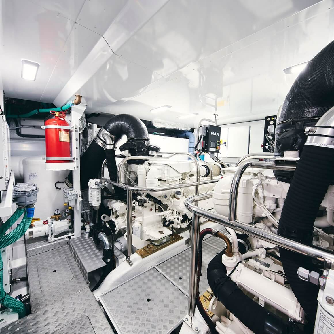 • Automatic/manual override fire extinguishers in engine room with warning system at both helm positions and incorporating engine air vent closure system