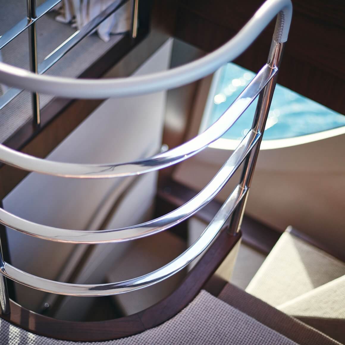 • Teak-laid transom platform, cockpit deck, flybridge, flybridge stairway and stairs to side decks