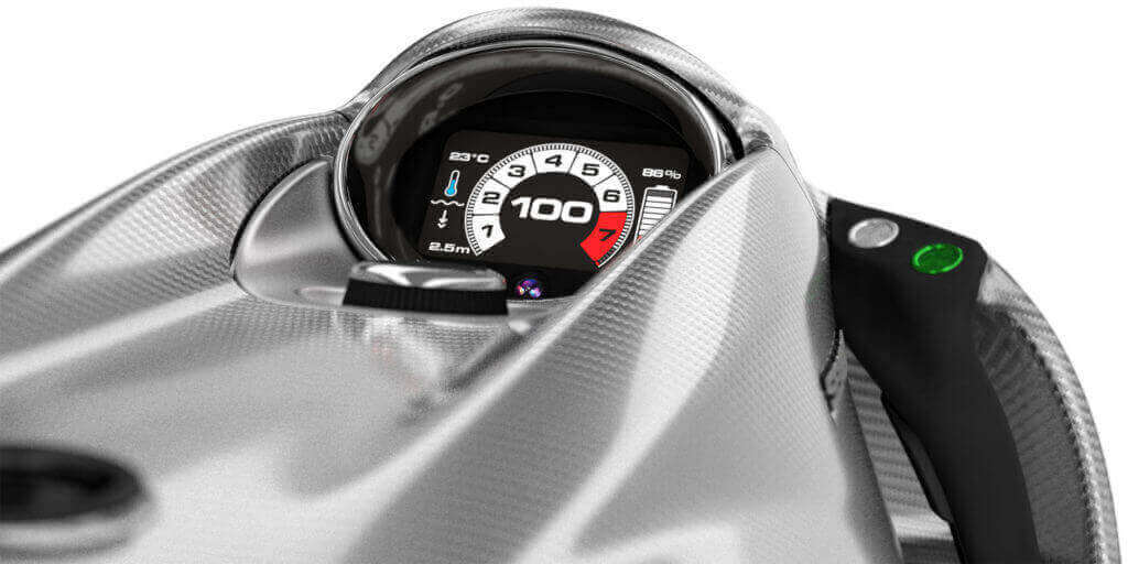 One particular distinguishing feature of the SEABOB F5 is its low weight. The E-Jet Power System in the SEABOB F5 is controlled in 4 power levels. These increments guarantee absolute fun and pleasure. Its special degree of dynamism in the water results from the high performance of the craft coupled with the low power-to-weight ratio.